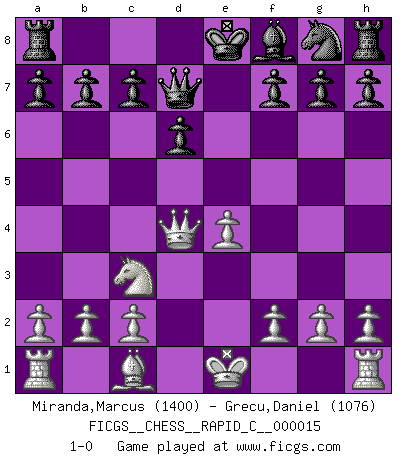 Last move : 1-0 2006 December 18 17:45:14 [Event "FICGS__CHESS__RAPID_C__000015"] [Site "FICGS"] [Date "2006.12.06"] [Round "1"] [White "Miranda,Marcus"] [Black "Grecu,Daniel"] [Result "1-0"] [WhiteElo "1400"] [BlackElo "1076"] 1.e4 e5 2.Nf3 Nc6 3.Bb5 d6 4.d4 Bd7 5.Nc3 exd4 6.Nxd4 Nxd4 7.Bxd7+ Qxd7 8.Qxd4 1-0 Ruy Lopez : Old Steinitz defense Player White won this chess game. Follow this game move after move (download)I look one move ahead... the best ! (Siegbert Tarrasch) Ich möchte Schüler heranbilden, die das Vermögen haben, selbst zu denken und Kritik zu üben. (Emanuel Lasker) De todos mis libros Rusos, la defensa contiene y difunde el 'calor' mas grande que pudiese verse extraño al observar lo supremamente abstracto que el Ajedrez supuestamente es. (Vladimir Nabokov) Roi des jeux et jeu des rois, les échecs portent en eux un sentiment d'infini. Ils donnent à celui qui s'est efforcé d'en approfondir les arcanes l'impression de n'être pas à la mesure de l'homme; en fait, ils constituent un résumé de l'univers, un microcosme, et figurent cette grande échelle qui, dans les plans de la lumière descend jusqu'à la matière, qui des abîmes insondables remonte jusqu'en l'infini de Dieu. (Pyrame) A good programmer is someone who always looks both ways before crossing a one-way street. (Doug Linder)