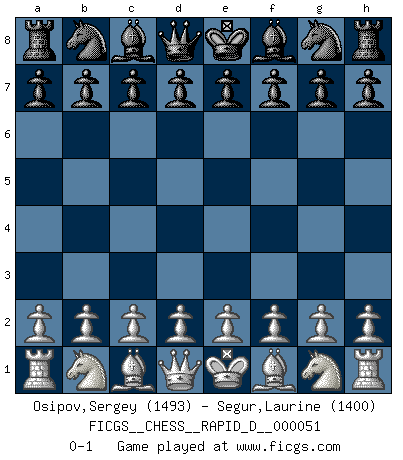 Last move : 0-1 2011 February 4 13:0:9 [Event "FICGS__CHESS__RAPID_D__000051"] [Site "FICGS"] [Date "2011.01.18"] [Round "1"] [White "Osipov,Sergey"] [Black "Segur,Laurine"] [Result "0-1"] [WhiteElo "1493"] [BlackElo "1400"] 0-1 Player Black won this chess game. Follow this game move after move (download)Methodical thinking is of more use in Chess than inspiration. (C. J. S. Purdy) Der Traum, für den ich lebe, ist der von einem freien Russland. Viele mögen sagen: Russland hat doch ein Parlament, einen gewählten Präsidenten. Aber ich spüre, dass in meiner Heimat die Angst wiederkehrt. Eine Angst, sich frei zu äußern, bestimmte Dinge zu tun (Garry Kasparov) Todos los jugadores de Ajedrez deberían tener un pasatiempo. (Savielly Tartakower) Les Echecs sont et restent toujours un combat, un combat intégral comme la boxe, la lutte ou un autre sport, et où il doit y avoir un vainqueur et un vaincu. (Joseph Emil Diemer) The production of too many useful things results in too many useless people. (Karl Marx)