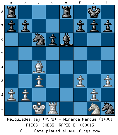 Last move : 0-1 2007 February 2 8:31:49 [Event "FICGS__CHESS__RAPID_C__000015"] [Site "FICGS"] [Date "2006.12.06"] [Round "1"] [White "Melquiades,Jay"] [Black "Miranda,Marcus"] [Result "0-1"] [WhiteElo "0978"] [BlackElo "1400"] 1.e4 e5 2.d4 exd4 3.Qxd4 Nc6 4.Qe3 Nf6 5.h3 Bb4+ 6.c3 Ba5 7.Nd2 Bb6 8.Qe2 O-O 9.Nc4 d6 10.Be3 Bxe3 11.Qxe3 Nxe4 12.O-O-O Re8 13.f3 Ng3 14.Qd2 Nxh1 15.Nxd6 Qxd6 16.Qxd6 cxd6 17.Bc4 Be6 0-1 This chess game has been lost on time (started : 2006.12.06 1:42:30) Centre game : Berger variation Kingside Castling by player Black (move 8) Queenside Castling by player White (move 12) Player Black won this chess game. Follow this game move after move (download)Before the endgame, the Gods have placed the middle game. (Siegbert Tarrasch) Die jungen Leute sollen verstehen, dass sie noch etwas von mir lernen können und müssen. (Viktor Kortschnoi) Una partida de Ajedrez se divide en 3 etapas: la primera cuando piensas que tienes la ventaja, la segunda cuando crees que tienes la ventaja y la tercera... ¡cuando te das cuenta que vas a perder!. (Savielly Tartakower) Tout change constamment, y compris dans le monde des Echecs. (Botvinnik) Philosophers use a language that is already deformed as though by shoes that are too tight. (Ludwig Wittgenstein)