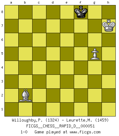 Last move : 1-0 2011 February 26 10:38:3 [Event "FICGS__CHESS__RAPID_D__000051"] [Site "FICGS"] [Date "2011.01.18"] [Round "1"] [White "Willoughby,Peter"] [Black "Leurette,Marc-Antoine"] [Result "1-0"] [WhiteElo "1324"] [BlackElo "1459"] 1.e4 e5 2.f4 Bc5 3.Nf3 d6 4.d4 exd4 5.Nxd4 Nf6 6.Nc3 Bg4 7.Be2 Bxd4 8.Qxd4 Bxe2 9.Nxe2 c5 10.Qe3 Nc6 11.O-O O-O 12.e5 dxe5 13.fxe5 Ng4 14.Qxc5 Ngxe5 15.Bf4 Nd7 16.Qc3 Re8 17.Ng3 Qf6 18.Qxf6 Nxf6 19.Bg5 Ne4 20.Nxe4 Rxe4 21.b3 Rae8 22.c4 f6 23.Bd2 Nd4 24.Rae1 Rxe1 25.Rxe1 Rxe1+ 26.Bxe1 Ne2+ 27.Kf1 Nc1 28.Bf2 Nxa2 29.Bxa7 f5 30.Be3 h6 31.Bd2 g5 32.b4 Kf7 33.Ke1 Ke6 34.Kd1 Kd6 35.Kc2 Kc6 36.Kb2 Nxb4 37.Bxb4 b5 38.Kc3 bxc4 39.Kxc4 Kd7 40.Kd5 f4 41.Bf8 h5 42.Bh6 f3 43.gxf3 g4 44.fxg4 hxg4 45.Ke5 Ke7 46.Kf5 g3 47.hxg3 Kf7 48.Bc1 Kg7 49.g4 Kf7 50.Kg5 Kg7 51.Bb2+ Kf7 52.Kh6 Kg8 53.g5 Kf8 54.Kh7 1-0 KGD : Classical variation Kingside Castling by player White (move 11) Kingside Castling by player Black (move 11) 10 pieces endgame at move 37 : White KBPPP , Black KPPPP WHITE : King + 1 Bishop 3 Pawns BLACK : King + 4 Pawns 9 pieces endgame at move 38 : White KBPP , Black KPPPP WHITE : King + 1 Bishop 2 Pawns BLACK : King + 4 Pawns 8 pieces endgame at move 39 : White KBPP , Black KPPP WHITE : King + 1 Bishop 2 Pawns BLACK : King + 3 Pawns 7 pieces endgame at move 43 : White KBPP , Black KPP WHITE : King + 1 Bishop 2 Pawns BLACK : King + 2 Pawns 6 pieces endgame at move 44 : White KBPP , Black KP WHITE : King + 1 Bishop 2 Pawns BLACK : King + 1 Pawn 5 pieces endgame at move 44 : White KBP , Black KP WHITE : King + 1 Bishop 1 Pawn BLACK : King + 1 Pawn 4 pieces endgame at move 47 : White KBP , Black K WHITE : King + 1 Bishop 1 Pawn BLACK : King + Player White won this chess game. Follow this game move after move (download)A great player and a great example for many. His book My 60 Memorable Games had a big impact on me. It is a shame he didn't continue to enrich the world of chess with his unparalleled understanding after 1972. (Jan Timman, about Bobby Fischer's death) Wie, soll nun auch die Opposition abgeschafft werden? Ja, es tut mir leid, Ihnen diesen Schmerz nicht ersparen zu können. (Aaron Nimzowitsch) Cuando tu casa esta en llamas, no puedes ser molestado por tus vecinos. O, como decinos en Ajedrez, si tu Rey esta bajo ataque, no te preocupa perder un Peón del lado de la Reina. (Gary Kasparov) J'ai vu le vaincu d'Echecs jouer des années durant dans l'espoir de la fête de la victoire. Car tu es plus riche de ce qu'elle existe si même elle n'est point pour toi. Ainsi de la perle du fond des mers. (Antoine de Saint-Exupéry) There are 10 types of people in this world: those who understand binary and those who don't. (Anonymous)