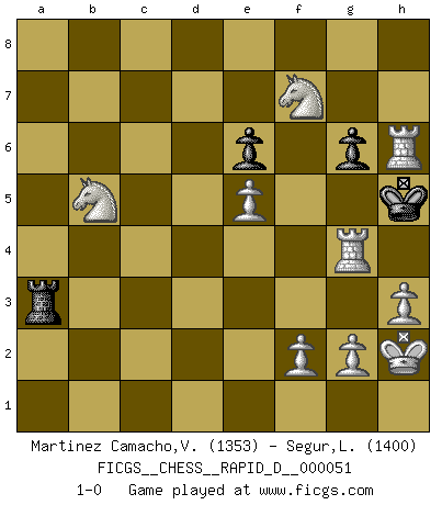 Last move : 1-0 2011 May 3 17:50:47 [Event "FICGS__CHESS__RAPID_D__000051"] [Site "FICGS"] [Date "2011.01.18"] [Round "1"] [White "Martinez Camacho,Victor Hugo"] [Black "Segur,Laurine"] [Result "1-0"] [WhiteElo "1353"] [BlackElo "1400"] 1.e4 c6 2.d4 d6 3.Nc3 b5 4.Nf3 Nd7 5.Bd3 c5 6.Bxb5 Ngf6 7.dxc5 dxc5 8.O-O g6 9.Be3 Bb7 10.e5 Ng4 11.Bxc5 Qc8 12.Ba3 Qc7 13.Qxd7+ Qxd7 14.Bxd7+ Kxd7 15.Rad1+ Ke8 16.Nb5 Rc8 17.h3 Nh6 18.Rd2 a6 19.Nc3 e6 20.Rfd1 Ng8 21.Bxf8 Kxf8 22.Rd7 Bc6 23.Ra7 Ra8 24.Rxa8+ Kg7 25.Rxa6 Ne7 26.Nd4 Bb7 27.Ra7 Rb8 28.Ndb5 Nc6 29.Ra3 Ne7 30.Nd6 Ba6 31.Rxa6 Rxb2 32.Ra7 Ng8 33.Rxf7+ Kh6 34.Rd4 Rxc2 35.Ncb5 Rxa2 36.Rg4 Kh5 37.Rxh7+ Nh6 38.Nf7 Ra1+ 39.Kh2 Ra3 40.Rxh6+ 1-0 Caro-Kann defense Kingside Castling by player White (move 8) Player White won this chess game. Follow this game move after move (download)Life is like a game of Chess, changing with each move. (Chinese proverb) Computer sind die einzigen Gegner, die nicht immer eine Ausrede auf Lager haben, wenn sie gegen mich verlieren. (Robert James Fischer) No todos los artistas son jugadores de Ajedrez, pero todos los jugadores de Ajedrez son artistas. (Marcel Duchamp) Echiquier : carré parfait, comme la Jérusalem nouvelle décrite par l'auteur de l'Apocalypse, huit cases sur huit, exaltation du chiffre 4, symbole du cosmos aux quatre horizons... où le noir et le blanc, l'ombre et la lumière, le mal et le bien s'entremêlent et se conjuguent. (Robert Couffignal, Le Gambit du poète) Drag your thoughts away from your troubles... by the ears, by the heels, or any other way you can manage it. (Mark Twain)