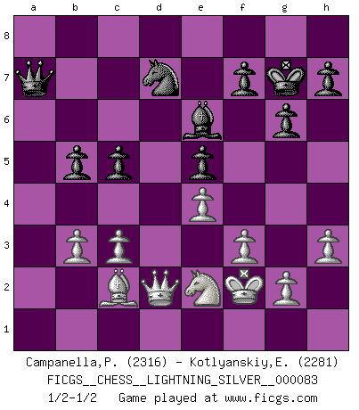 Last move : 1/2-1/2 2011 January 19 1:15:38 [Event "FICGS__CHESS__LIGHTNING_SILVER__000083"] [Site "FICGS"] [Date "2011.01.19"] [Round "1"] [White "Campanella,Paul"] [Black "Kotlyanskiy,Edward"] [Result "1/2-1/2"] [WhiteElo "2316"] [BlackElo "2281"] 1.e4 c5 2.Nc3 Nc6 3.Nf3 d6 4.Bc4 g6 5.O-O Bg7 6.h3 Nf6 7.d3 O-O 8.a3 Nd4 9.Re1 e6 10.Bf4 a6 11.Bb3 Nh5 12.Bd2 b5 13.Nxd4 Bxd4 14.Qc1 Bb7 15.Bh6 Re8 16.Ne2 Bh8 17.c3 Qc7 18.Qe3 d5 19.Bc2 e5 20.Qf3 dxe4 21.dxe4 Bg7 22.Bxg7 Kxg7 23.Red1 Rad8 24.a4 Rxd1+ 25.Rxd1 Rd8 26.Rxd8 Qxd8 27.Qe3 Qd6 28.axb5 axb5 29.f3 Bc8 30.Kf1 Nf6 31.Kf2 Be6 32.Qd3 Qa6 33.Qe3 Nd7 34.Qd2 Qa1 35.b3 Qa7 1/2-1/2 Sicilian : Closed, 2...Nc6 Kingside Castling by player White (move 5) Kingside Castling by player Black (move 7) This chess game ended in a draw. Follow this game move after move (download)Some sacrifices are sound; the rest are mine. (Mikhail Tal) Man gibt nur Pakete auf. (Paul Keres) Una buena ofensiva y una buena defensa, comienzan ambas con un buen desarrollo. (Bruce A. Moon) Si je n'étais pas joueur d'échecs, je serais le meilleur dans quelque chose d'autre. (Anatoli Karpov) I find your interest interesting. (Gregory House, House M.D.)