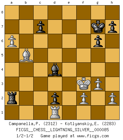 Last move : 1/2-1/2 2011 January 20 1:21:9 [Event "FICGS__CHESS__LIGHTNING_SILVER__000085"] [Site "FICGS"] [Date "2011.01.20"] [Round "1"] [White "Campanella,Paul"] [Black "Kotlyanskiy,Edward"] [Result "1/2-1/2"] [WhiteElo "2312"] [BlackElo "2283"] 1.e4 e5 2.Nf3 Nc6 3.d4 exd4 4.Nxd4 Nf6 5.Nxc6 bxc6 6.e5 Qe7 7.Qe2 Nd5 8.c4 Ba6 9.b3 g6 10.g3 Bg7 11.Bb2 O-O 12.Bh3 f6 13.O-O fxe5 14.Nd2 Rae8 15.Ne4 Nb6 16.Qd2 d5 17.Qa5 Bxc4 18.Ba3 Qf7 19.bxc4 Nxc4 20.Qxa7 Nxa3 21.Qxa3 dxe4 22.Bg2 Rd8 23.Bxe4 Rd2 24.Qc5 Qd7 25.a4 Qd4 26.Qxd4 exd4 27.a5 d3 28.Ra4 Rd8 29.a6 Rd4 30.Bxc6 Rxa4 31.Bxa4 Bd4 32.Kg2 Kg7 33.Kf3 Ra2 34.Bb5 d2 35.Rd1 1/2-1/2 Scotch : Mieses variation Kingside Castling by player Black (move 11) Kingside Castling by player White (move 13) This chess game ended in a draw. Follow this game move after move (download)Human affairs are like a Chess game: only those who do not take it seriously can be called good players. (Hung Tzu Ch'eng) Matt entspricht nicht immer den Tatsachen. (Savielly Grigorievitsch Tartakower) ¡Examina movidas que hagan daño! Un buen ojo for movidas desvastantes es mucho mas importante que el conocimiento de principios estratégicos. (Purdy) Dieu déplace le joueur, et celui-ci la pièce. Quel Dieu derrière Dieu commence donc la trame ? Arturo Perez-Reverte (prix de littérature policière 1993). Ah, beer! The cause of, and the solution to, all of life's problems. (Homer Simpson)