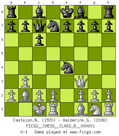 Last move : 0-1 2006 June 11 10:13:5 [Event "FICGS__CHESS__CLASS_B__000001"] [Site "FICGS"] [Date "2006.04.09"] [Round "1"] [White "Castejon,Nicolas"] [Black "Aalderink,Gerwin"] [Result "0-1"] [WhiteElo "1920"] [BlackElo "2036"] 1.Nc3 d5 2.e4 c6 3.Qf3 dxe4 4.Nxe4 Nd7 5.b3 Ngf6 6.Bb2 Qc7 7.O-O-O Nxe4 0-1 This chess game has been lost on time (started : 2006.04.09 0:24:26) Dunst (Sleipner, Heinrichsen) Opening Queenside Castling by player White (move 7) Player Black won this chess game. Follow this game move after move (download)Chess is so inspiring that I do not believe a good player is capable of having an evil thought during the game. (Wilhelm Steinitz) Intelligenz läßt sich nicht am Weg, sondern nur am Ergebnis feststellen. (Garry Kasparov) ¡Examina movidas que hagan daño! Un buen ojo for movidas desvastantes es mucho mas importante que el conocimiento de principios estratégicos. (Purdy) Un millionnaire : 'Monsieur Steinitz ! Vous ne participez aux tournois que pour l'argent, alors que moi je n'y viens que pour l'honneur.' Steinitz : 'Chacun joue pour ce qu'il n'a pas'... Even the best needles are not sharp at both ends. (Chinese proverb)
