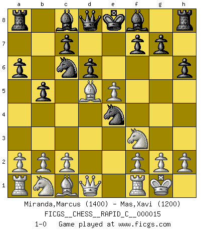 Last move : 1-0 2007 January 17 0:27:56 [Event "FICGS__CHESS__RAPID_C__000015"] [Site "FICGS"] [Date "2006.12.06"] [Round "1"] [White "Miranda,Marcus"] [Black "Mas,Xavi"] [Result "1-0"] [WhiteElo "1400"] [BlackElo "1200"] 1.e4 e5 2.Nf3 Nc6 3.Bb5 a6 4.Ba4 b5 5.Bb3 Nf6 6.O-O h6 7.d4 d6 8.dxe5 Nxe4 9.Bd5 1-0 This chess game has been lost on time (started : 2006.12.06 1:42:30) Ruy Lopez : Caro variation Kingside Castling by player White (move 6) Player White won this chess game. Follow this game move after move (download)I played Chess with him and would have beaten him sometimes only he always took back his last move, and ran the game out differently. (Mark Twain) Wenn Du einsam bist, wenn Du Dich in der Welt wie ein Fremder fühlst, spiele Schach. Das wird Deinen Geist erheben und Dein Ratgeber im Kampf sein. (Aristoteles) ¿Porque tengo que perder ante este idiota?. (Aron Nimzovich) On peut tirer plus d'utilité d'une partie perdue que de 100 parties gagnées. (Capablanca) Without deviation from the norm, progress is not possible. (Frank Zappa)