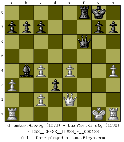 Last move : 0-1 2011 March 23 15:21:8 [Event "FICGS__CHESS__CLASS_E__000133"] [Site "FICGS"] [Date "2011.01.20"] [Round "1"] [White "Khramkov,Alexey"] [Black "Quanter,Kirsty"] [Result "0-1"] [WhiteElo "1279"] [BlackElo "1390"] 1.e4 e5 2.Nc3 Nf6 3.f4 d5 4.fxe5 Nxe4 5.Nf3 Nc6 6.d3 Nxc3 7.bxc3 d4 8.Bd2 Bc5 9.Bg5 Qd5 10.c4 Qe6 11.Qe2 O-O 12.a3 Re8 13.Bf4 f6 14.Nd2 Nxe5 15.Bxe5 Qa6 16.Ne4 Rxe5 17.g4 Bb4+ 18.Kf2 f5 19.gxf5 Bxf5 20.Bg2 Rf8 21.Kg1 Bxe4 22.Bxe4 Qf6 23.h4 Rxe4 24.dxe4 d3 0-1 Vienna gambit Kingside Castling by player Black (move 11) Player Black won this chess game. Follow this game move after move (download)It is always better to sacrifice your opponent's men. (Savielly Tartakower) Die Elozahlen sind sehr schlecht für das Schach. Jetzt ist Schach eine Sportindustrie, die darauf zielt Elopunkte zu machen. (Miguel Najdorf) Debemos de asegurarnos de que el Ajedrez no se convierta en un lenguaje muerto, muy interesante, pero solo para un grupo muy pequeño. (Sytze Faber) Toutes choses étant égales, c'est la conviction qui gagne. Alliée à une volonté de vaincre, elle sert de détonateur, suscite des idées, disperse les doutes et aide à penser clairement. (Robert Fischer) May the force be with you. (Han Solo in Star Wars ep.4)
