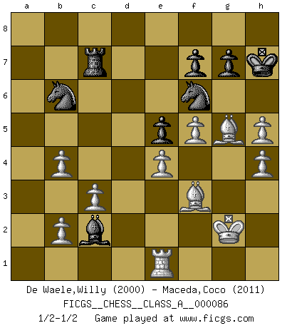 Last move : 1/2-1/2 2011 June 26 18:10:39 [Event "FICGS__CHESS__CLASS_A__000086"] [Site "FICGS"] [Date "2011.01.20"] [Round "1"] [White "De Waele,Willy"] [Black "Maceda,Coco"] [Result "1/2-1/2"] [WhiteElo "2000"] [BlackElo "2011"] 1.e4 c5 2.Nf3 d6 3.d4 cxd4 4.Nxd4 Nf6 5.Nc3 a6 6.Be2 e5 7.Nb3 Be7 8.O-O O-O 9.Be3 Be6 10.Qd3 Nc6 11.Rad1 Rc8 12.Qd2 Qc7 13.Rfe1 Nb8 14.f4 b5 15.a3 Nbd7 16.f5 Bc4 17.Bf3 a5 18.Nxa5 Qxa5 19.Nd5 Qd8 20.Nxe7+ Qxe7 21.Qxd6 Qxd6 22.Rxd6 b4 23.axb4 Bb5 24.c3 h6 25.g4 Rfd8 26.Rd2 Rf8 27.h4 h5 28.gxh5 Kh7 29.R2d1 Rc7 30.Ra1 Rb8 31.Ra5 Bd3 32.Bg5 Bc2 33.Kg2 Nb6 34.Rc5 Rbc8 35.Rxc7 Rxc7 1/2-1/2 Sicilian : Najdorf, Opovcensky variation Kingside Castling by player White (move 8) Kingside Castling by player Black (move 8) This chess game ended in a draw. Follow this game move after move (download)When you absolutely don't know what to do anymore, it is time to panic. (John van der Wiel) Du musst Deinen Gegner in einen tiefen dunklen Wald führen wo 2+2=5 ist und wo der Weg, der wieder hinausführt, nur breit genug für einen ist. (Mikhail Nekhemyevich Tal) Con el fin de mejorar tu juego, debes de estudiar los finales antes que todo, ya que mientras que los finales pueden ser estudiados y dominados por sí mismos, el juegomedio y la apertura deben de ser estudiados en relación con los finales. (José Raúl Capablanca) Mais l'homme est une créature légère et illogique : semblable au joueur d'échecs, il n'aime que le processus du but à atteindre, non le but lui-même. (Dostoïevsky) The ego is not master in its own house. (Sigmund Freud)