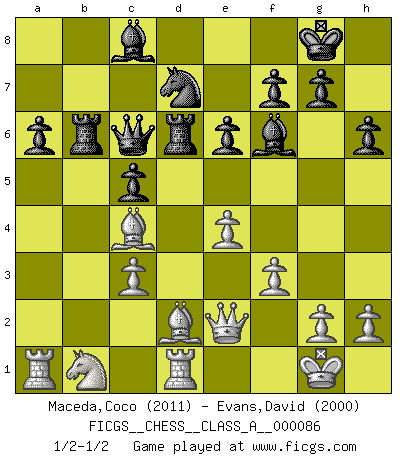 Last move : 1/2-1/2 2011 May 13 19:54:6 [Event "FICGS__CHESS__CLASS_A__000086"] [Site "FICGS"] [Date "2011.01.20"] [Round "1"] [White "Maceda,Coco"] [Black "Evans,David"] [Result "1/2-1/2"] [WhiteElo "2011"] [BlackElo "2000"] 1.e4 c5 2.Nf3 d6 3.d4 cxd4 4.Nxd4 Nf6 5.Nc3 a6 6.Bg5 Nbd7 7.Bc4 Qb6 8.Bb3 e6 9.O-O Be7 10.a4 Nc5 11.a5 Qc7 12.Re1 h6 13.Be3 O-O 14.Qf3 Rb8 15.Ba2 b5 16.axb6 Rxb6 17.Nb3 Rb4 18.Nxc5 dxc5 19.Bf4 Qc6 20.Qe2 Rxb2 21.Bc4 Rb6 22.Bd2 Rd8 23.Nb1 Rd4 24.f3 Nd7 25.c3 Bf6 26.Rd1 Rd6 1/2-1/2 Sicilian : Najdorf, 6.Bg5 Kingside Castling by player White (move 9) Kingside Castling by player Black (move 13) This chess game ended in a draw. Follow this game move after move (download)You are for me the Queen on d8 and I am the Pawn on d7 !! (Eduard Gufeld) Der zweitbeste Zug ist oft der einzig richtige. (Savielly Grigorievitsch Tartakower) EL Ajedrez es como la vida. (Boris Spassky) Karpov est une pièce de musée. (Garry Kasparov) Go and wake up your luck. (Persian saying)