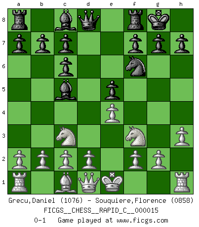 Last move : 0-1 2006 December 18 17:43:27 [Event "FICGS__CHESS__RAPID_C__000015"] [Site "FICGS"] [Date "2006.12.06"] [Round "1"] [White "Grecu,Daniel"] [Black "Souquiere,Florence"] [Result "0-1"] [WhiteElo "1076"] [BlackElo "0858"] 1.e4 Nc6 2.Nc3 e5 3.Nf3 Bc5 4.Bb5 Nf6 5.h3 O-O 6.Bxc6 dxc6 0-1 KP : Nimzovich defense Kingside Castling by player Black (move 5) Player Black won this chess game. Follow this game move after move (download)When I have White, I win because I am white; When I have Black, I win because I am Bogolyubov. (Bogolyubov) Schach ist Krieg, im Schach geht es um testosterongesteuerte Urschreie. (Garry Kasparov) La vida es como un juego de Ajedrez, cambiando con cada movimiento. (Proverbio Chino) Un journaliste : 'Vous préférez avoir une dame de plus sur l'échiquier ou au lit ?' Boris Spassky : 'Ca dépend de la position.' Yoga is 99% practice and 1% knowledge. (Sri Krishna Pattabhi Jois)