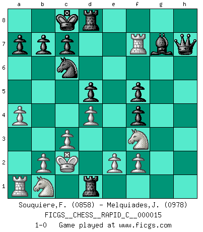 Last move : 1-0 2007 February 1 20:19:34 [Event "FICGS__CHESS__RAPID_C__000015"] [Site "FICGS"] [Date "2006.12.06"] [Round "1"] [White "Souquiere,Florence"] [Black "Melquiades,Jay"] [Result "1-0"] [WhiteElo "0858"] [BlackElo "0978"] 1.Nf3 d5 2.d4 f6 3.Bf4 Nc6 4.c3 e5 5.g4 exf4 6.Bh3 h5 7.Rg1 hxg4 8.Bxg4 Bxg4 9.Rxg4 g5 10.h3 Rxh3 11.a4 f5 12.Rxg5 Qe7 13.Rxg8 O-O-O 14.Rg6 Qh7 15.Rf6 Bg7 16.Rf7 Rh1+ 17.Kd2 Rxd1+ 18.Kc2 1-0 This chess game has been lost on time (started : 2006.12.06 1:42:30) Reti Opening Queenside Castling by player Black (move 13) Player White won this chess game. Follow this game move after move (download)The Chess pieces are the block alphabet which shapes thoughts; and these thoughts, although making a visual design on the chessboard, express their beauty abstractly, like a poem. (Marcel Duchamp) In Buenos Aires ist es nicht mein vorrangiges Ziel ein starkes Turnier zu organisieren, sondern ein Turnier für Gentlemen. Ich würde nie Kamsky einladen. Ich mag keine Probleme. (Miguel Najdorf) No nos podemos resistir a la fascinación de un sacrificio ya que la pasión por los sacrificios es parte de la naturaleza de un jugador de Ajedrez. (Rudolf Spielman) Toutes les manuvres exécutées sur une colonne ouverte ont pour but ultime l'intrusion définitive sur la septième ou la huitième rangée, en plein cur de la position ennemie. (Aaron Nimzovitch) Life is like internet, nothing interesting, but noone want to leave it. (Ilmars Cirulis)