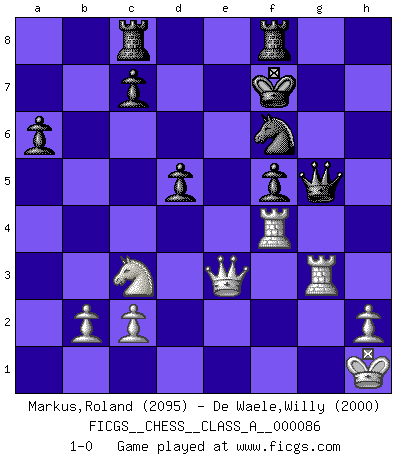 Last move : 1-0 2011 March 1 12:13:0 [Event "FICGS__CHESS__CLASS_A__000086"] [Site "FICGS"] [Date "2011.01.20"] [Round "1"] [White "Markus,Roland"] [Black "De Waele,Willy"] [Result "1-0"] [WhiteElo "2095"] [BlackElo "2000"] 1.d4 d5 2.e4 dxe4 3.Nc3 Nf6 4.f3 exf3 5.Nxf3 e6 6.Bg5 Be7 7.Bd3 Nc6 8.a3 h6 9.Bf4 a6 10.Qd2 b5 11.Rd1 Bb7 12.Qf2 O-O 13.O-O b4 14.axb4 Nxb4 15.Ne5 Nxd3 16.Rxd3 Rc8 17.Bxh6 gxh6 18.Rg3+ Kh7 19.Rh3 Qe8 20.Qe3 Ng8 21.Ng4 f5 22.Nxh6 Bxg2 23.Kxg2 Qg6+ 24.Rg3 Qxh6 25.Rh3 Bh4 26.Rf4 Qg5+ 27.Kh1 Kg6 28.R3xh4 Nf6 29.Rh3 Kf7 30.d5 exd5 31.Rg3 1-0 Blackmar gambit Kingside Castling by player Black (move 12) Kingside Castling by player White (move 13) Player White won this chess game. Follow this game move after move (download)Only the player with the initiative has the right to attack. (Wilhelm Steinitz) Das Schachspiel übertrifft alle anderen Spiele so weit wie der Chimborasso einen Misthaufen. (Arthur Schopenhauer) En un gambito tu regalas un Peón por el bién de tomar un juego perdido. (Samuel Standige Boden) Ne tendez aucun piège pour le plaisir ! Ne jouez rien dans l'espoir que l'adversaire réagisse de façon stupide ! Prenez toujours pour acquis que l'adversaire va trouver le meilleur coup ! Ne jouez jamais de coup dans l'espoir que l'adversaire ne voie pas la menace ! Chacun de vos coups doit améliorer la position d'une façon ou d'une autre. It's not a bug - it's an undocumented feature. (Anonymous)