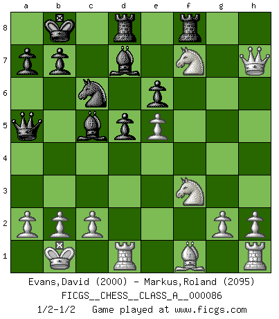 Last move : 1/2-1/2 2011 February 7 11:44:57 [Event "FICGS__CHESS__CLASS_A__000086"] [Site "FICGS"] [Date "2011.01.20"] [Round "1"] [White "Evans,David"] [Black "Markus,Roland"] [Result "1/2-1/2"] [WhiteElo "2000"] [BlackElo "2095"] 1.e4 c6 2.d4 d5 3.e5 c5 4.dxc5 Nc6 5.Nf3 e6 6.Be3 Nh6 7.Bxh6 gxh6 8.Nc3 Bxc5 9.Qd2 Bd7 10.O-O-O Qa5 11.Qxh6 O-O-O 12.Kb1 Bxf2 13.Nb5 Kb8 14.Nd6 Rhf8 15.Qxh7 Bc5 16.Nxf7 1/2-1/2 Caro-Kann : Advance variation Queenside Castling by player White (move 10) Queenside Castling by player Black (move 11) This chess game ended in a draw. Follow this game move after move (download)Chess is the gymnasium of the mind. (Blaise Pascal) Im Schach gibt es keinen Platz für Galanterie. (Irving Chernev) La señal de un Gran Maestro es su habilidad de ganar una partida rápidamente y sin dolor. (Irving Chernev) Le système Elo représente seulement une moyenne. Il est simplement un indicateur de votre stabilité. (Anatoli Karpov) When you stop learning you start dying. (Scott Adams)