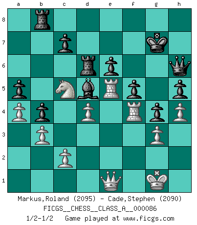 Last move : 1/2-1/2 2011 March 21 11:28:49 [Event "FICGS__CHESS__CLASS_A__000086"] [Site "FICGS"] [Date "2011.01.20"] [Round "1"] [White "Markus,Roland"] [Black "Cade,Stephen"] [Result "1/2-1/2"] [WhiteElo "2095"] [BlackElo "2090"] 1.d4 d5 2.e4 dxe4 3.Nc3 Nf6 4.f3 exf3 5.Nxf3 e6 6.Bg5 Be7 7.Bd3 Nc6 8.a3 h6 9.Bf4 a6 10.Qd2 b5 11.Ne2 Bb7 12.O-O g5 13.Bg3 Nh5 14.Bf2 g4 15.Ne1 Bg5 16.Be3 Bxe3+ 17.Qxe3 Qg5 18.Qf2 O-O 19.Be4 f5 20.Bxc6 Bxc6 21.Nd3 Rad8 22.Rae1 Rd6 23.Ng3 Nxg3 24.Qxg3 Be4 25.Nc5 Bd5 26.Rf4 h5 27.h4 Qf6 28.Qf2 a5 29.a4 b4 30.Re5 Kg7 31.b3 Qh6 32.g3 Rb8 33.Qe1 1/2-1/2 Blackmar gambit Kingside Castling by player White (move 12) Kingside Castling by player Black (move 18) This chess game ended in a draw. Follow this game move after move (download)Tactics flow from a superior position. (Bobby Fischer) Modernes Schach sorgt sich zuviel um Dinge wie Bauernstruktur usw. Vergessen Sie das, Schachmatt beendet das Spiel! (Nigel Short) Al jugar al Ajedrez entonces, podemos aprender: Primero: Previsión... Segundo: Prudencia... Tercero: Cautela... Y al final, aprendemos del Ajedrez el hábito de no ser desanimados por apariencias malas presentes en el estado de nuestros asuntos, el hábito de la esperanza por una oportunidad favorable y la perseveración de los secretos de los recursos. (Benjamin Franklin) Ce qui est bien, c'est d'avoir tout un tas de pièces en prise : l'adversaire ne peut en prendre qu'une à la fois. Cité par Thierry Audin. Hardware: the parts of a computer that can be kicked. (Jeff Persis)