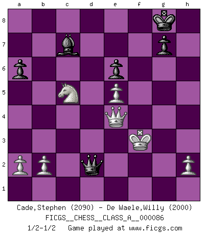 Last move : 1/2-1/2 2011 February 10 18:25:15 [Event "FICGS__CHESS__CLASS_A__000086"] [Site "FICGS"] [Date "2011.01.20"] [Round "1"] [White "Cade,Stephen"] [Black "De Waele,Willy"] [Result "1/2-1/2"] [WhiteElo "2090"] [BlackElo "2000"] 1.e4 c5 2.Nc3 Nc6 3.Bb5 e5 4.d3 a6 5.Bxc6 dxc6 6.Nge2 Nf6 7.O-O Be6 8.f4 exf4 9.Nxf4 Bd6 10.Qe2 Be5 11.Nxe6 fxe6 12.Be3 b6 13.Na4 O-O 14.c3 Ra7 15.Rad1 Qb8 16.g3 Raf7 17.d4 Bc7 18.Bf4 cxd4 19.cxd4 h5 20.e5 Nd5 21.Qxh5 Nxf4 22.gxf4 Rxf4 23.Rxf4 Rxf4 24.Qg6 Qc8 25.Rf1 Rxf1+ 26.Kxf1 c5 27.dxc5 bxc5 28.Qe4 Qd7 29.Nxc5 Qd1+ 30.Kg2 Qd2+ 31.Kf3 Qd1+ 32.Kg2 Qd2+ 33.Kf3 1/2-1/2 Sicilian : Closed, 2...Nc6 Kingside Castling by player White (move 7) Kingside Castling by player Black (move 13) This chess game ended in a draw. Follow this game move after move (download)A big shock; the best chess player in history has passed away. (Lajos Portisch, about Bobby Fischer's death) Ich bin es gewohnt, das die Jugend mir überhaupt keinen Respekt entgegenbringt. (Alexander Morozewich) El Ajedrez te enseña a controlarl la excitación inicial que sientes cuando vez algo que parece bueno y te enseña a pensar objetivamente cuando te encuentras en problemas. (Stanley Kubrick) Les échecs, c'est l'imagination. (David Bronstein) Memory is a crazy woman that hoards colored rags and throws away food. (Austin O'Malley)