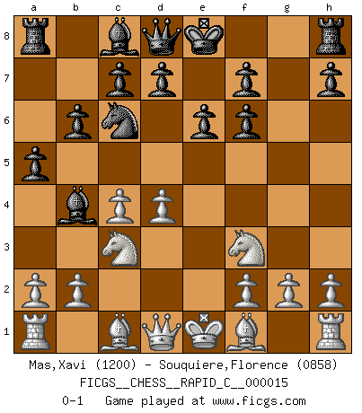 Last move : 0-1 2007 January 16 6:25:48 [Event "FICGS__CHESS__RAPID_C__000015"] [Site "FICGS"] [Date "2006.12.06"] [Round "1"] [White "Mas,Xavi"] [Black "Souquiere,Florence"] [Result "0-1"] [WhiteElo "1200"] [BlackElo "0858"] 1.c4 Nc6 2.e4 Nf6 3.Nc3 b6 4.d4 e6 5.e5 a5 6.exf6 gxf6 7.Nf3 Bb4 0-1 This chess game has been lost on time (started : 2006.12.06 1:42:30) English Opening Player Black won this chess game. Follow this game move after move (download)If cunning alone were needed to excel, women would be the best Chess players. (Albin) Der Verteidiger gebe der Gewalt nach, aber nur der Gewalt. Er schaffe sich nicht freiwillig, etwa aus Blindheit oder aus Schrecken, irgendwelche Schwächen. Er lasse sich nicht bluffen. (Emanuel Lasker) Solo existe una cosa que Fischer hace en el Ajedrez sin placer: ¡perder!. (Boris Spassky) Assurément je connaissais par expérience le mystérieux attrait de ce jeu royal, le seul entre tous les jeux inventés par les hommes qui échappe souverainement à la tyrannie du hasard, le seul où l'on ne doive sa victoire qu'à son intelligence ou plutôt à une certaine forme d'intelligence. Mais n'est-ce pas déjà le limiter injurieusement que d'appeler les échecs un jeu ? N'est-ce pas une science, un art ou quelque chose qui, comme le cercueil de Mahomet entre ciel et terre, est suspendu entre l'un et l'autre, et qui réunit un nombre incroyable de contraires ? [...] C'est une pensée qui ne mène à rien, une mathématique qui n'établit rien, un art qui ne laisse pas d'uvre, une architecture sans matière; et il l'a prouvé néanmoins qu'il était plus durable, à sa manière, que les livres ou que tout autre monument, ce jeu unique qui appartient à tous les peuples et à tous les temps, et dont personne ne sait quel dieu en fit don à la terre pour tuer l'ennui, pour aiguiser l'esprit et stimuler l'âme. Où commence-t-il, où finit-il ? (Stefan Zweig) That's absurd. I love it. (Gregory House, House M.D.)