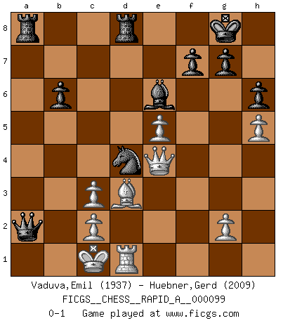 Last move : 0-1 2011 March 28 21:42:55 [Event "FICGS__CHESS__RAPID_A__000099"] [Site "FICGS"] [Date "2011.01.20"] [Round "1"] [White "Vaduva,Emil"] [Black "Huebner,Gerd"] [Result "0-1"] [WhiteElo "1937"] [BlackElo "2009"] 1.e4 c5 2.Nf3 d6 3.d4 cxd4 4.Nxd4 Nf6 5.Nc3 Nc6 6.Bg5 e6 7.Qd2 Qb6 8.Nb3 Be7 9.O-O-O O-O 10.f3 a6 11.h4 Qc7 12.h5 h6 13.Bxf6 Bxf6 14.Qxd6 Qb6 15.Qc5 Qc7 16.Kb1 b6 17.Qd6 Qb7 18.Qg3 Bxc3 19.bxc3 Bd7 20.Be2 e5 21.Rd6 Be6 22.f4 exf4 23.Qxf4 Rac8 24.Rhd1 Qc7 25.Bxa6 Ra8 26.Bd3 Ne7 27.e5 Qa7 28.Rc6 Qxa2+ 29.Kc1 Nxc6 30.Qe4 Rfd8 31.Nd4 Nxd4 0-1 Sicilian : Richter-Rauzer, Rauzer attack Queenside Castling by player White (move 9) Kingside Castling by player Black (move 9) Player Black won this chess game. Follow this game move after move (download)When you see a good move, look for a better one. (Emanuel Lasker) Man wirke der falschen Auffassung entgegen, als ob jeder Zug Unmittelbares zu leisten habe; auch Werte- und Ruhezüge haben ihre Existenzberechtigung. (Aaron Nimzowitsch) ¿Cual es el objetivo de jugar una apertura de gambito?... Para adquirir una reputación de ser un jugador apuesto a costo de perder el juego. (Siegbert Tarrasch) Roi des jeux et jeu des rois, les échecs portent en eux un sentiment d'infini. Ils donnent à celui qui s'est efforcé d'en approfondir les arcanes l'impression de n'être pas à la mesure de l'homme; en fait, ils constituent un résumé de l'univers, un microcosme, et figurent cette grande échelle qui, dans les plans de la lumière descend jusqu'à la matière, qui des abîmes insondables remonte jusqu'en l'infini de Dieu. (Pyrame) A proverb is a short sentence based on long experience. (Miguel de Cervantes)