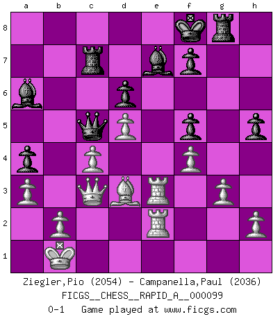 Last move : 0-1 2011 February 21 15:12:21 [Event "FICGS__CHESS__RAPID_A__000099"] [Site "FICGS"] [Date "2011.01.20"] [Round "1"] [White "Ziegler,Pio"] [Black "Campanella,Paul"] [Result "0-1"] [WhiteElo "2054"] [BlackElo "2036"] 1.e4 c5 2.Nf3 Nc6 3.d4 cxd4 4.Nxd4 Nf6 5.Nc3 d6 6.Bg5 e6 7.Qd2 a6 8.O-O-O Bd7 9.f4 h6 10.Bh4 b5 11.a3 Qb6 12.Nxc6 Bxc6 13.Bxf6 gxf6 14.Be2 Rg8 15.Rhe1 a5 16.Bf3 Be7 17.Nd5 exd5 18.exd5 Bd7 19.Qe2 Qd8 20.Rd3 Bc8 21.Re3 Ra7 22.Qd3 Rg7 23.Qxb5+ Kf8 24.Kb1 f5 25.Qc4 Rc7 26.Qd4 Kg8 27.Qb6 Rd7 28.Qc6 Kf8 29.Qc3 Rg8 30.Qd4 Qc7 31.Rc3 Qb8 32.g3 Rb7 33.Rce3 Rc7 34.c4 Ba6 35.Be2 Qa7 36.Qc3 a4 37.Bd3 h5 38.R1e2 Qc5 0-1 Sicilian defense Queenside Castling by player White (move 8) Player Black won this chess game. Follow this game move after move (download)Avoid the crowd. Do your own thinking independently. Be the Chess player, not the Chess piece. (Ralph Charell) Der 70jährige Viktor Kortschnoi: Die Rentenanstalt wollte mich zwingen in Rente zu gehen. Meine Frau erhält jetzt eine Pension- und ich zahle weiter in die Rentenkasse ein! (Viktor Kortschnoi) Tu sabes que vas a perder. Aún cuando tenía la ventaja, yo sabía que iba a perder. - al estar jugando con Fischer (Andrew Soltis) Les écrivains ont utilisé les échecs pour analyser les côtés extrêmes de la nature humaine. Dans ce cadre, les échecs offrent un champ d'expérimentation idéal. Mais on pourrait faire la même chose avec la peinture. Et là, en vous référant à Van Gogh, vous ne tirerez pas de conclusion définitive sur les peintres. (Gary Kasparov) I don't believe in psychology. I believe in good moves. (Bobby Fischer)