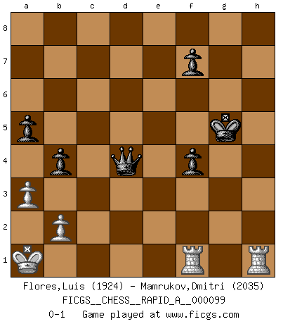 Last move : 0-1 2011 May 2 15:9:11 [Event "FICGS__CHESS__RAPID_A__000099"] [Site "FICGS"] [Date "2011.01.20"] [Round "1"] [White "Flores,Luis"] [Black "Mamrukov,Dmitri"] [Result "0-1"] [WhiteElo "1924"] [BlackElo "2035"] 1.e4 c6 2.d4 d5 3.Nc3 dxe4 4.Nxe4 Bf5 5.Ng3 Bg6 6.h4 h6 7.Nf3 Nd7 8.h5 Bh7 9.Bd3 Bxd3 10.Qxd3 e6 11.Bf4 Qa5+ 12.Bd2 Bb4 13.c3 Be7 14.c4 Qc7 15.O-O-O Ngf6 16.Kb1 O-O 17.Ne4 Rad8 18.Nxf6+ Nxf6 19.Qe2 c5 20.g4 cxd4 21.g5 hxg5 22.Bxg5 d3 23.Qe5 Qxc4 24.h6 Rd5 25.hxg7 Rxe5 26.gxf8Q+ Kxf8 27.Nxe5 Qb5 28.Rh8+ Kg7 29.Rh4 Ng8 30.Rg4 Bxg5 31.Rxg5+ Kf6 32.Rh5 Qa4 33.Rxd3 Qe4 34.a3 Ke7 35.f3 Qe1+ 36.Ka2 Nf6 37.Rg5 Nd5 38.Rb3 Kf6 39.Nd3 Qe2 40.Rg4 Qxf3 41.Ra4 a6 42.Nc5 Qd1 43.Rc4 b5 44.Rh4 Qe1 45.Rh6+ Kg7 46.R6h3 Nf4 47.Rbg3+ Kf6 48.Rf3 e5 49.Nd3 Qe4 50.Ka1 Qd4 51.Nxf4 exf4 52.Rf1 a5 53.Rh6+ Kg5 54.R6h1 b4 0-1 Caro-Kann : Classical, 7...Nd7 Queenside Castling by player White (move 15) Kingside Castling by player Black (move 16) Promotion Queen by player White (move 26) Player Black won this chess game. Follow this game move after move (download)It is the aim of the modern school, not to treat every position according to one general law, but according to the principle inherent in the position. (Richard Reti) Im Leben werden Partien nie so unstrittig gewonnen wie im Spiel (Emanuel Lasker) Por la belleza de sus partidas, la claridad de su juego y lo brillante de sus ideas, Fischer se creó el mismo como un artista de la misma estatura como Brahms, Rembrandt y Shakespeare. (David Levy) Psychologiquement, tu dois avoir confiance en toi même, mais cette confiance doit être basée sur des faits. (Robert Fischer) The quality of decision is like the well-timed swoop of a falcon which enables it to strike and destroy its victim. (Sun Tzu)