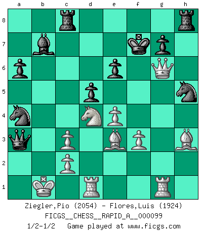 Last move : 1/2-1/2 2011 February 12 13:21:23 [Event "FICGS__CHESS__RAPID_A__000099"] [Site "FICGS"] [Date "2011.01.20"] [Round "1"] [White "Ziegler,Pio"] [Black "Flores,Luis"] [Result "1/2-1/2"] [WhiteElo "2054"] [BlackElo "1924"] 1.e4 c5 2.Nf3 d6 3.d4 cxd4 4.Nxd4 Nf6 5.Nc3 a6 6.Be3 e6 7.f3 b5 8.Qd2 Nbd7 9.g4 h6 10.a3 Bb7 11.O-O-O Rc8 12.h4 d5 13.Rg1 b4 14.axb4 Bxb4 15.g5 hxg5 16.hxg5 Nh5 17.g6 Bxc3 18.bxc3 Qe7 19.gxf7+ Kxf7 20.Bh3 Qa3+ 21.Kb1 Nc5 22.Qg2 Na4 23.Qg6+ 1/2-1/2 Sicilian : Najdorf, Byrne (English) attack Queenside Castling by player White (move 11) This chess game ended in a draw. Follow this game move after move (download)We don't really know how the game was invented, though there are suspicions. As soon as we discover the culprits, we'll let you know. (Bruce Pandolfini) Alle offensichtlichen Züge sehen nach dem Spiel in der Analyse verdächtig aus. (Viktor Kortschnoi) Yo adoro todas la posiciones. Denme una partida posicional difícil, y la jugaré. Pero posiciones totalmente ganadas, no las tolero. (Hein Donner) Le temps de noter son nom sur la feuille de partie, j'étais déjà en zeitnot ! D'un modeste amateur apparié lors de la première ronde d'un open contre le grand-maître Azmaïparashvili. Creativity is inventing, experimenting, growing, taking risks, breaking rules, making mistakes, and having fun. (Mary Lou Cook)