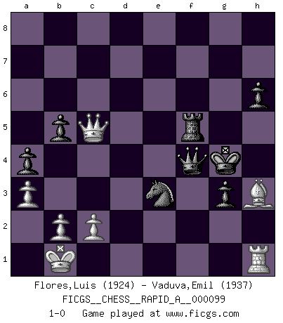 Last move : 1-0 2011 April 19 12:21:2 [Event "FICGS__CHESS__RAPID_A__000099"] [Site "FICGS"] [Date "2011.01.20"] [Round "1"] [White "Flores,Luis"] [Black "Vaduva,Emil"] [Result "1-0"] [WhiteElo "1924"] [BlackElo "1937"] 1.e4 c5 2.Nf3 d6 3.d4 cxd4 4.Nxd4 Nf6 5.Nc3 a6 6.Bg5 e6 7.f4 Be7 8.Qf3 Qc7 9.O-O-O Nbd7 10.g4 b5 11.Bxf6 Nxf6 12.g5 Nd7 13.f5 Bxg5+ 14.Kb1 Ne5 15.Qh5 Qe7 16.Nxe6 Bxe6 17.fxe6 g6 18.exf7+ Kxf7 19.Qe2 Kg7 20.Nd5 Qd8 21.Bh3 Rf8 22.Rhf1 Ra7 23.Be6 Re8 24.Qf2 Rb7 25.Nf4 Rf8 26.Qg3 Bxf4 27.Rxf4 Re7 28.Bb3 R7e8 29.a3 Rxf4 30.Qxf4 Rf8 31.Qd2 a5 32.Qd5 a4 33.Ba2 Qb6 34.Qe6 Kh6 35.Qe7 Qd8 36.Qa7 Qh4 37.Qe3+ Kh5 38.Bd5 Qxh2 39.Qb6 Rf2 40.Rc1 g5 41.Qxd6 h6 42.Qa6 g4 43.Qe6 Kg5 44.Qe7+ Rf6 45.Be6 Qf4 46.Rd1 g3 47.Bh3 Qxe4 48.Rd6 Qf4 49.Rd5 Kh4 50.Bg2 Ng4 51.Qc5 Ne3 52.Rh5+ Kg4 53.Rh1 Rf5 54.Bh3+ 1-0 Sicilian : Najdorf, 7...Be7 Queenside Castling by player White (move 9) Player White won this chess game. Follow this game move after move (download)Fischer is the strongest player in the world. In fact, the strongest player who ever lived. (Larry Evans) Schach ist Leben. (Robert James Fischer) Debemos de asegurarnos de que el Ajedrez no se convierta en un lenguaje muerto, muy interesante, pero tan solo para un grupo muy pequeño. (Sytze Faber) Je fais ceci parce que dans cinquante coups j'obtiendrai cela; je m'appelle Mikhail Moisevitch Botvinnik. (Botvinnik) The only difference between a tax man and a taxidermist is that the taxidermist leaves the skin. (Mark Twain)