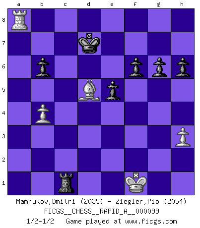 Last move : 1/2-1/2 2011 March 19 7:8:14 [Event "FICGS__CHESS__RAPID_A__000099"] [Site "FICGS"] [Date "2011.01.20"] [Round "1"] [White "Mamrukov,Dmitri"] [Black "Ziegler,Pio"] [Result "1/2-1/2"] [WhiteElo "2035"] [BlackElo "2054"] 1.d4 Nf6 2.c4 e6 3.g3 d5 4.Nf3 Bb4+ 5.Bd2 Be7 6.Bg2 O-O 7.O-O c6 8.Qc2 b6 9.Bf4 Bb7 10.Rd1 Nbd7 11.b3 Rc8 12.Nc3 c5 13.e4 cxd4 14.exd5 dxc3 15.d6 Be4 16.Qxc3 Nd5 17.Qd4 Bf6 18.Qxe4 Nc5 19.Qb1 Nxf4 20.gxf4 Bxa1 21.Qxa1 Rc6 22.d7 Qb8 23.b4 Nxd7 24.Rxd7 Rxc4 25.Ne5 Qc8 26.Rd1 Rxf4 27.Qb2 Rf5 28.Nc6 Qc7 29.Qa3 Rg5 30.Qc1 h6 31.f4 Rg4 32.h3 Rxf4 33.Ne7+ Qxe7 34.Qxf4 Rd8 35.Rc1 e5 36.Qe4 g6 37.Re1 Re8 38.Qc6 Rd8 39.Qc3 f6 40.a4 Rd7 41.a5 Qd8 42.axb6 Qxb6+ 43.Qc5 Kf7 44.Kf1 Rc7 45.Bd5+ Ke8 46.Qxb6 axb6 47.Ra1 Kd7 48.Ra8 Rc1+ 1/2-1/2 Catalan Opening Kingside Castling by player Black (move 6) Kingside Castling by player White (move 7) This chess game ended in a draw. Follow this game move after move (download)One bad move nullifies forty good ones. (Horowitz) Nicht daß Diemer aus Opportunismus Mitglied der NSDAP geworden wäre. Er war ein Fanatiker, in allem, was er tat. (Hans Ree) Una mala movida nulifica cuarenta buenas. (Horowitz) Les échecs, c'est l'imagination. (David Bronstein) All politicians must be presumed guilty until they are proven innocent. (Dinesh De Silva)