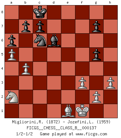 Last move : 1/2-1/2 2011 July 6 22:3:0 [Event "FICGS__CHESS__CLASS_B__000137"] [Site "FICGS"] [Date "2011.01.21"] [Round "1"] [White "Migliorini,Roberto"] [Black "Jozefini,Lubor"] [Result "1/2-1/2"] [WhiteElo "1872"] [BlackElo "1959"] 1.e4 e5 2.Nf3 Nc6 3.Bb5 Nge7 4.O-O Ng6 5.c3 a6 6.Ba4 d5 7.exd5 Qxd5 8.d4 Bg4 9.Bb3 Bxf3 10.Bxd5 Bxd1 11.Rxd1 O-O-O 12.Bxf7 exd4 13.cxd4 Rxd4 14.Rxd4 Nxd4 15.Bxg6 hxg6 16.Nc3 Bd6 17.h3 Nc2 18.Rb1 Nb4 19.Bd2 Be7 20.a3 Nd3 21.b4 Bf6 22.Ne4 Rd8 23.Kf1 Bb2 24.a4 Bd4 25.f3 Nb2 26.a5 Rd5 27.Ke2 Nc4 28.Be1 Bf6 29.Rc1 Ne5 30.Nc5 Nc6 31.Kf1 Rd6 32.Rc4 g5 33.Rc1 Bb2 34.Rc2 Be5 35.Nb3 Rd1 36.Rc1 Rxc1 37.Nxc1 Bd6 38.Na2 1/2-1/2 Ruy Lopez : Cozio defense Kingside Castling by player White (move 4) Queenside Castling by player Black (move 11) This chess game ended in a draw. Follow this game move after move (download)Chess is a terrific way for kids to build self image and self esteem. (Saudin Robovic) Das Blackmar-Diemer-Gambit verändert den ganzen Menschen! (Emil Joseph Diemer) Realmente no sabemos como el juego fue inventado, aunque hay sospechas. Tan pronto como descubramos a los culpables, se los haremos saber. (Bruce Pandolfini) Des points faibles ou des trous dans la position de l'adversaire doivent être occupés par des pièces et non pas par des pions. (Siegbert Tarrasch) Life is like a play: it's not the length but the excellence of the acting that matters. (Seneca)