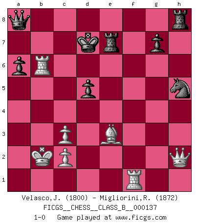 Last move : 1-0 2011 February 27 14:40:13 [Event "FICGS__CHESS__CLASS_B__000137"] [Site "FICGS"] [Date "2011.01.21"] [Round "1"] [White "Velasco,Jose Maria"] [Black "Migliorini,Roberto"] [Result "1-0"] [WhiteElo "1800"] [BlackElo "1872"] 1.e4 c5 2.Nf3 d6 3.d4 cxd4 4.Nxd4 Nf6 5.Nc3 a6 6.Be3 e6 7.f3 b5 8.Qd2 Nbd7 9.g4 h6 10.O-O-O Bb7 11.a3 Rc8 12.Rg1 d5 13.h4 b4 14.axb4 Bxb4 15.g5 Bxc3 16.bxc3 hxg5 17.hxg5 Nh5 18.g6 Qa5 19.Kb2 Ne5 20.gxf7+ Kxf7 21.f4 Nc4+ 22.Bxc4 Rxc4 23.Ra1 Qc7 24.f5 exf5 25.Nxf5 Rxe4 26.Raf1 Ke8 27.Rg6 Kd7 28.Nd6 Re7 29.Nxb7 Qxb7+ 30.Rb6 Qa8 31.Qh2 1-0 Sicilian : Najdorf, Byrne (English) attack Queenside Castling by player White (move 10) Player White won this chess game. Follow this game move after move (download)In the perfect Chess combination as in a first-rate short story, the whole plot and counter-plot should lead up to a striking finale, the interest not being allayed until the very last moment. (Yates and Winter) Ich bin Weltmeister und muß mit niemandem irgend etwas diskutieren. (Viswanathan Anand) El Ajedrez es un terrible juego. Si no controlas el centro, tu oponente tiene una posición mas holgada. Si tienes control del centro, ¡entonces realmente tu tienes algo de que preocuparte!. (Siegbert Tarrasch) RxDa4 pat (...) You think that education is too expensive ? Try ignorance. (Derek Bok)