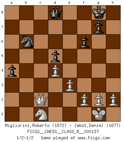 Last move : 1/2-1/2 2011 April 23 14:28:52 [Event "FICGS__CHESS__CLASS_B__000137"] [Site "FICGS"] [Date "2011.01.21"] [Round "1"] [White "Migliorini,Roberto"] [Black "Jabot,Daniel"] [Result "1/2-1/2"] [WhiteElo "1872"] [BlackElo "1877"] 1.d4 d5 2.c4 e6 3.Nc3 Nf6 4.Bg5 Nbd7 5.e3 c6 6.Nf3 Bb4 7.cxd5 exd5 8.Bd3 Qa5 9.Qc2 O-O 10.O-O Be7 11.Bxh7+ Nxh7 12.Bxe7 Re8 13.Bh4 Ndf6 14.Ne5 Ng4 15.Nxg4 Bxg4 16.b4 Qb6 17.b5 Rac8 18.Qb3 Be6 19.Rfc1 Nf8 20.a4 a5 21.Bg3 Nd7 22.Qd1 Bf5 23.Bh4 Be6 24.Qh5 f6 25.Rab1 Bf7 26.Qg4 Qd8 27.bxc6 Rxc6 28.Rxb7 Nb6 29.Ne2 Rxc1+ 30.Nxc1 Re4 31.Qg3 Rxh4 32.Rxf7 Kxf7 33.Qxh4 Nxa4 34.Qh5+ Kg8 35.Qg6 Nb6 36.Qc2 a4 1/2-1/2 QGD Kingside Castling by player Black (move 9) Kingside Castling by player White (move 10) This chess game ended in a draw. Follow this game move after move (download)Chess demands total concentration. (Bobby Fischer) Ich kenne Menschen, die allen Willen der Welt besitzen und doch nicht Schach spielen können. (Robert James Fischer) Yo adoro todas la posiciones. Denme una partida posicional difícil, y la jugaré. Pero posiciones totalmente ganadas, no las tolero. (Hein Donner) Karpov est une pièce de musée. (Garry Kasparov) A good player is always lucky. (Capablanca)