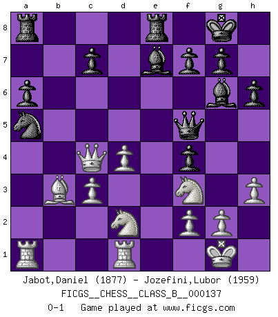 Last move : 0-1 2011 November 11 0:34:55 [Event "FICGS__CHESS__CLASS_B__000137"] [Site "FICGS"] [Date "2011.01.21"] [Round "1"] [White "Jabot,Daniel"] [Black "Jozefini,Lubor"] [Result "0-1"] [WhiteElo "1877"] [BlackElo "1959"] 1.e4 e5 2.Nf3 Nc6 3.Bb5 Nge7 4.O-O Ng6 5.c3 a6 6.Ba4 d5 7.exd5 Qxd5 8.Bb3 Qd3 9.Ng5 Be7 10.Bc2 Qd7 11.Nf3 O-O 12.Re1 Rd8 13.d3 h6 14.Nbd2 Qd5 15.Ne4 Bf5 16.h3 b5 17.Qe2 Nf8 18.Rd1 Ne6 19.Bb3 Qd7 20.a4 Bg6 21.Be3 b4 22.a5 Nf4 23.Bxf4 exf4 24.d4 Qf5 25.Ned2 bxc3 26.bxc3 Re8 27.Qc4 Nxa5 0-1 This chess game has been lost on time (started : 2011.01.21 8:6:22) Ruy Lopez : Cozio defense Kingside Castling by player White (move 4) Kingside Castling by player Black (move 11) Player Black won this chess game. Follow this game move after move (download)Checkers is for tramps. (Paul Morphy) Weshalb minderdergeübte Spieler mit g2-g4 beginnen? Die betreffenden sind unschlüssig, ob sie nun rechts (h4) oder links (f4) beginnen sollen, und in ihrer Ratlosigkeit entschliessen sie sich nach guter Bürgerart dazu, den goldenen Mittelweg zu wählen. (Aaron Nimzowitsch) Del Ajedrez se ha dicho que la vida no es lo suficientemente larga para él, pero eso es culpa de la vida, no del Ajedrez. (William Ewart Napier) Psychologiquement, tu dois avoir confiance en toi même, mais cette confiance doit être basée sur des faits. (Robert Fischer) There is no instance of a country having benefited from prolonged warfare. (Sun Tzu)