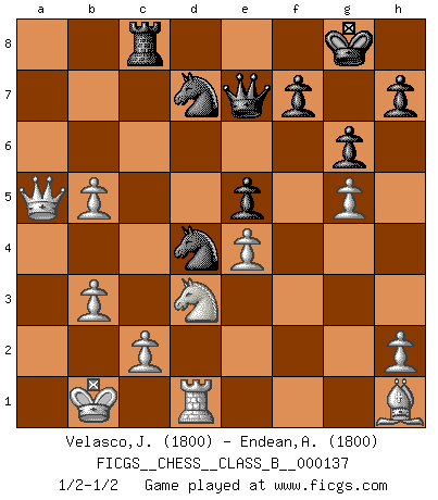 Last move : 1/2-1/2 2011 March 20 12:35:53 [Event "FICGS__CHESS__CLASS_B__000137"] [Site "FICGS"] [Date "2011.01.21"] [Round "1"] [White "Velasco,Jose Maria"] [Black "Endean,Andrew"] [Result "1/2-1/2"] [WhiteElo "1800"] [BlackElo "1800"] 1.e4 c5 2.Nf3 d6 3.d4 cxd4 4.Nxd4 Nf6 5.Nc3 a6 6.Be3 e6 7.f3 b5 8.Qd2 Nbd7 9.a3 Bb7 10.g4 Nb6 11.O-O-O Rc8 12.Kb1 Nfd7 13.Rg1 Ne5 14.b3 Ned7 15.Bg5 Be7 16.Bxe7 Qxe7 17.f4 O-O 18.Bg2 Rc5 19.Bh1 Rfc8 20.Rg3 Qd8 21.Rh3 Qc7 22.Na2 Nf8 23.Nb4 Nbd7 24.g5 Qd8 25.Na2 g6 26.Rc3 e5 27.fxe5 dxe5 28.Ne2 Qe7 29.Nb4 a5 30.Nd3 Rxc3 31.Nxc3 Ne6 32.Nxb5 Ba6 33.a4 Bxb5 34.axb5 Nd4 35.Qxa5 1/2-1/2 Sicilian : Najdorf, Byrne (English) attack Queenside Castling by player White (move 11) Kingside Castling by player Black (move 17) This chess game ended in a draw. Follow this game move after move (download)Even the laziest King flees wildly in the face of a double check ! (Aaron Nimzowitsch) Im Hotelzimmer gab es nur zwei Schaben. (Über die Turnierbedingungen) (Peter Swidler) Una buena memoria, concentración, imaginación y una fuerte voluntad, se requiere para llegar a ser un buen jugador. (Bobby Fischer) Les Echecs ne sont pas pour les âmes timides. Ils requièrent un homme entier, qui ne s'arrête pas aveuglément à ce qui a été déjà établi, mais qui tente individuellement de sonder les profondeurs du jeu. (W. Steinitz) I believe in luck. How else can you explain the success of those you dislike ? (Jean Cocteau)