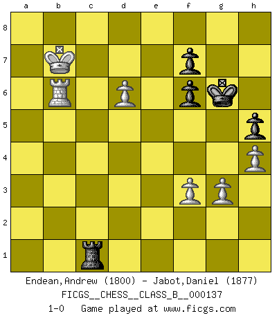 Last move : 1-0 2011 November 29 2:31:25 [Event "FICGS__CHESS__CLASS_B__000137"] [Site "FICGS"] [Date "2011.01.21"] [Round "1"] [White "Endean,Andrew"] [Black "Jabot,Daniel"] [Result "1-0"] [WhiteElo "1800"] [BlackElo "1877"] 1.d4 d5 2.c4 e6 3.Nc3 Nf6 4.Bg5 Nbd7 5.e3 c6 6.Nf3 Qa5 7.cxd5 Nxd5 8.Qd2 Bb4 9.Rc1 h6 10.Bh4 c5 11.a3 Bxc3 12.bxc3 cxd4 13.cxd4 Qxa3 14.e4 N5f6 15.Bd3 O-O 16.O-O Re8 17.Ra1 Qf8 18.Rfc1 a6 19.Rc7 Rb8 20.h3 b5 21.Bg3 Nh5 22.Bh2 Nhf6 23.Rac1 Rd8 24.Ra7 Rb7 25.Rxa6 Nb6 26.Ne5 Nc4 27.Bxc4 bxc4 28.Nc6 Re8 29.f3 Bd7 30.Be5 Rc8 31.Rxc4 Bxc6 32.Raxc6 Rxc6 33.Rxc6 Qb4 34.Qxb4 Rxb4 35.Bxf6 gxf6 36.d5 exd5 37.exd5 Kg7 38.Kf2 Rb5 39.d6 Rd5 40.Ke3 Kg6 41.Ke4 Rd2 42.g3 h5 43.Rb6 Rd1 44.h4 Re1+ 45.Kd5 Rd1+ 46.Kc6 Rc1+ 47.Kb7 1-0 This chess game has been lost on time (started : 2011.01.21 8:6:22) QGD : Cambridge Springs defense, Yugoslav variation Kingside Castling by player Black (move 15) Kingside Castling by player White (move 16) Player White won this chess game. Follow this game move after move (download)We like to think. (Gary Kasparov) Wer wird heute Abend ihr Gegner sein? -- Heute Abend spiele ich gegen die schwarzen Steine. (Akiba Rubinstein) a manera como él juega al Ajedrez, demuestra la completa naturaleza de un hombre. (Stanley Ellin) Si le désir cupide (et stupide) de gagner est une inépuisable source de souffrance, une combinaison brillante sur l'échiquier est une découverte : le coquelicot qui s'épanouit lorsque apparaît la Voie Lactée. (Arrabal) There is no vagueness without wind. (Chinese proverb)