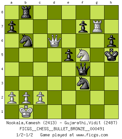Last move : 1/2-1/2 2011 January 21 18:20:50 [Event "FICGS__CHESS__BULLET_BRONZE__000491"] [Site "FICGS"] [Date "2011.01.21"] [Round "1"] [White "Nookala,Kamesh"] [Black "Gujarathi,Vidit"] [Result "1/2-1/2"] [WhiteElo "2413"] [BlackElo "2487"] 1.e4 c6 2.d4 d5 3.Nd2 dxe4 4.Nxe4 Bf5 5.Ng3 Bg6 6.h4 h6 7.Nf3 Nd7 8.h5 Bh7 9.Bd3 Bxd3 10.Qxd3 e6 11.Bf4 Qa5+ 12.Bd2 Bb4 13.Ne4 Bxd2+ 14.Nfxd2 Ngf6 15.Nd6+ Ke7 16.Nxb7 Qb4 17.Qb3 Qxd4 18.O-O-O Rab8 19.Qa3+ c5 20.Na5 Rhc8 21.f3 Qf4 22.Nac4 Rd8 23.g3 Qxg3 24.Rhg1 Qc7 25.Rxg7 Nb6 26.Ne3 Nxh5 27.Rh7 Nf4 28.Re1 Rxd2 29.Kxd2 Ng2 30.Nf5+ Kf6 31.Kc1 Qf4+ 32.Kb1 Nxe1 33.Qc3+ e5 34.Qxc5 Nxf3 35.Qd6+ Kg5 36.Rg7+ Kh5 37.Ng3+ Kh4 38.Nf5+ Kh5 1/2-1/2 Caro-Kann : 3.Nd2 Queenside Castling by player White (move 18) This chess game ended in a draw. Follow this game move after move (download)Every Chess master was once a beginner. (Chernev) Kostenjuk hat keinen Sexappeal. (Loek van Wely) El Ajedrez es el gimnasio de la mente. (Blaise Pascal) La conception d'un plan est le processus par lequel un joueur exploite les avantages de sa position tout en s'efforçant d'en réduire au minimum les inconvénients. Afin de garantir le succès, un plan doit toujours se fonder sur un diagnostic objectif des particularités d'une position. La conception d'un plan est d'autant plus difficile que la position est équilibrée, et grandement facilitée lorsqu'il n'existe qu'un seul plan susceptible de répondre aux exigences de la position. (Harry Golombek) The question of whether computers can think is just like question of whether submarines can swim. (Edsger W. Dijkstra)