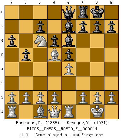 Last move : 1-0 2011 January 23 18:23:1 [Event "FICGS__CHESS__RAPID_E__000044"] [Site "FICGS"] [Date "2011.01.21"] [Round "1"] [White "Barradas,Anderson"] [Black "Kehayov,Yulian"] [Result "1-0"] [WhiteElo "1236"] [BlackElo "1071"] 1.e4 e5 2.Nf3 Nc6 3.Bb5 a6 4.Ba4 Nf6 5.O-O Be7 6.Re1 b5 7.Bb3 d6 8.Nc3 O-O 9.Nd5 Nd4 10.Nxd4 Nxd5 11.Bxd5 Rb8 12.Nc6 Qe8 13.Nxb8 Be6 14.Nc6 1-0 Ruy Lopez : Closed Kingside Castling by player White (move 5) Kingside Castling by player Black (move 8) Player White won this chess game. Follow this game move after move (download)Chess is the art of analysis. (Mikhail Botvinnik) Bis jetzt ist Weiß einer wohlbekannten Analyse gefolgt. Aber jetzt begeht er einen schrecklichen Fehler: Er beginnt seinen eigenen Kopf zu benutzen. (Siegbert Tarrasch) Un jugador que es sorprendido, esta derrotado a medias. (Proverbio) La tactique, c'est ce que vous faites quand il y a quelque chose à faire; la stratégie, c'est ce que vous faites quand il n'y a rien à faire. (Savielli Tartacower) Games, world of games... There's always an opponent, and there's always a victim. (Revolver, movie)