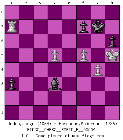 Last move : 1-0 2011 February 3 11:21:6 [Event "FICGS__CHESS__RAPID_E__000044"] [Site "FICGS"] [Date "2011.01.21"] [Round "1"] [White "Orden,Jorge"] [Black "Barradas,Anderson"] [Result "1-0"] [WhiteElo "1068"] [BlackElo "1236"] 1.e4 c5 2.Nf3 e6 3.d4 cxd4 4.Nxd4 Bc5 5.Be3 a6 6.a3 h6 7.Be2 Nc6 8.c3 d6 9.b4 Bxd4 10.cxd4 e5 11.d5 Nd4 12.Bxd4 exd4 13.Qxd4 Qf6 14.Qxf6 Nxf6 15.Nc3 O-O 16.h3 Re8 17.Bd3 b6 18.O-O a5 19.b5 Bd7 20.a4 Rac8 21.Rac1 Rc4 22.f4 Nxe4 23.Bxc4 Nd2 24.Rfe1 Rxe1+ 25.Rxe1 Nxc4 26.Re7 Bf5 27.Rc7 Bd3 28.Kf2 Kf8 29.g4 g5 30.f5 Nb2 31.Kg3 Bc2 32.h4 Nxa4 33.Nxa4 Bxa4 34.Rc6 Bxb5 35.Rxb6 gxh4+ 36.Kxh4 Bd3 37.Rxd6 Kg7 38.Kh5 a4 39.Rd7 a3 40.Ra7 1-0 Sicilian defense Kingside Castling by player Black (move 15) Kingside Castling by player White (move 18) 10 pieces endgame at move 37 : White KRPPP , Black KBPPP WHITE : King + 1 Rook 3 Pawns BLACK : King + 1 Bishop 3 Pawns Player White won this chess game. Follow this game move after move (download)The older I grow, the more I value pawns. (Paul Keres) Die starken Figuren des Gegners muss man abtauschen. (José Raúl Capablanca) Fischer no está bajo la obligación de nadie. (Joseph Platz) Même si l'adversaire joue le coup analysé précédemment, recommencez l'analyse en voyant la nouvelle position. Première règle de Blumenfeld A good aphorism is too hard for the tooth of time, and is not worn away with the centuries, although it serves as food for every speech. (Friedrich Nietzsche)