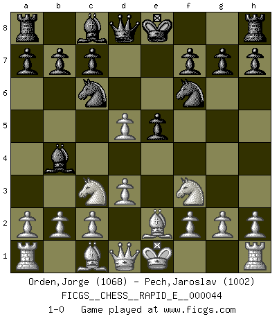 Last move : 1-0 2011 March 10 12:21:16 [Event "FICGS__CHESS__RAPID_E__000044"] [Site "FICGS"] [Date "2011.01.21"] [Round "1"] [White "Orden,Jorge"] [Black "Pech,Jaroslav"] [Result "1-0"] [WhiteElo "1068"] [BlackElo "1002"] 1.e4 Nf6 2.Nc3 e5 3.Nf3 Nc6 4.Be2 Bb4 5.d3 d5 6.exd5 1-0 Alekhine's defense Player White won this chess game. Follow this game move after move (download)A passed Pawn increases in strength as the number of pieces on the board diminishes. (Capablanca) Vom Schach wurde gesagt das Leben sei dafür nicht lange genug. Aber das ist der Fehler des Lebens, nicht des Schach'. (Irving Chernev) El Ajedrez era la lengua materna de Capablanca. (Reti) A chaque perte on perd un peu de soi. (Joël Lautier) I know the human being and fish can coexist peacefully. (George W. Bush, Saginaw sept. 29, 2000)
