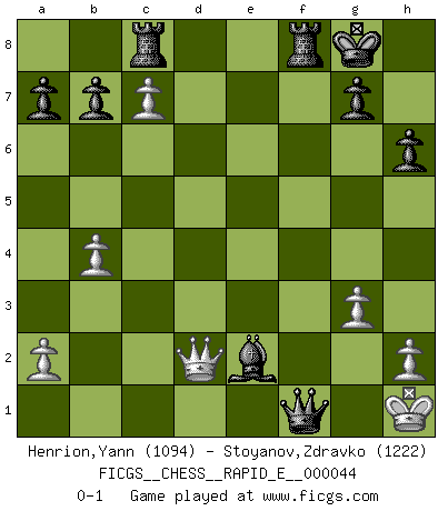Last move : 0-1 2011 February 12 16:16:39 [Event "FICGS__CHESS__RAPID_E__000044"] [Site "FICGS"] [Date "2011.01.21"] [Round "1"] [White "Henrion,Yann"] [Black "Stoyanov,Zdravko"] [Result "0-1"] [WhiteElo "1094"] [BlackElo "1222"] 1.c4 d6 2.d4 e6 3.Nc3 Nc6 4.Nf3 Be7 5.e4 Nf6 6.d5 exd5 7.exd5 Nb8 8.Bg5 h6 9.Bh4 O-O 10.Bd3 Nh5 11.Bxe7 Qxe7+ 12.Ne4 f5 13.O-O fxe4 14.Re1 Qf6 15.b3 exf3 16.g3 Bh3 17.Be4 Bg2 18.Re3 Nd7 19.Bxf3 Bxf3 20.Qe1 Ne5 21.Rc1 Qf5 22.c5 Qh3 23.Qf1 Qg4 24.R1c3 Nf4 25.cxd6 Nxd5 26.Rxe5 Nxc3 27.dxc7 Ne2+ 28.Rxe2 Bxe2 29.Qe1 Rac8 30.Qd2 Qf3 31.b4 Qxf2+ 32.Kh1 Qf1+ 0-1 English Opening Kingside Castling by player Black (move 9) Kingside Castling by player White (move 13) Player Black won this chess game. Follow this game move after move (download)A win by an unsound combination, however showy, fills me with artistic horror. (Wilhelm Steinitz) Es ist wirklich schade, dass so viele Schachspieler nicht auf ihr Äußeres achten! (Alexandra Kosteniuk) El Ajedrez es una manera fabulosa para que los niños aprendan a autovalorarse y a autoestimarse. (Saudin Robovic) En blitz, le Cavalier l'emporte sur le Fou. (Vlastimil Hort) Statistics can be made to prove anything - even the truth. (Author unknown)