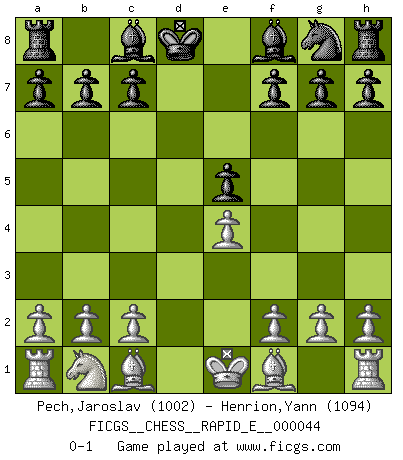 Last move : 0-1 2011 March 13 4:52:20 [Event "FICGS__CHESS__RAPID_E__000044"] [Site "FICGS"] [Date "2011.01.21"] [Round "1"] [White "Pech,Jaroslav"] [Black "Henrion,Yann"] [Result "0-1"] [WhiteElo "1002"] [BlackElo "1094"] 1.e4 e5 2.Nf3 d6 3.d4 Nc6 4.dxe5 Nxe5 5.Nxe5 dxe5 6.Qxd8+ Kxd8 0-1 Philidor's defense Player Black won this chess game. Follow this game move after move (download)Chess is like war on a board. (Bobby Fischer) Der Verteidiger gebe der Gewalt nach, aber nur der Gewalt. Er schaffe sich nicht freiwillig, etwa aus Blindheit oder aus Schrecken, irgendwelche Schwächen. Er lasse sich nicht bluffen. (Emanuel Lasker) Bobby Fischer es el jugador de Ajedrez mas grande que jamás haya existido. (Ken Smith) C'est une question de caractère, Beaucoup de gens perdent leur motivation très vite. D'autres, ils sont rares, peuvent la conserver très longtemps. J'aime les échecs, encore aujourd'hui je suis heureux d'analyser des parties. J'aime toujours gagner, je déteste encore perdre. Bien jouer est important pour mon intégrité intellectuelle et morale. Et puis les échecs vivent en ce moment une période historique grâce à Internet. Ils se développent dans les systèmes éducatifs à travers le monde. Ils sortent de leur ghetto, et c'est mon rôle de mener à bien cette révolution. (Gary Kasparov) They say poker is a zero-sum game. It must be, because every time I play my sum ends up zero. (Max Shapiro)