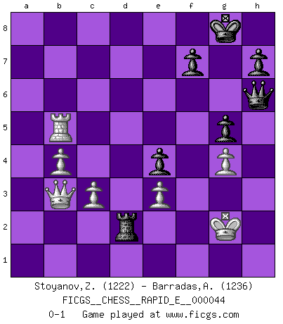 Last move : 0-1 2011 January 24 14:54:28 [Event "FICGS__CHESS__RAPID_E__000044"] [Site "FICGS"] [Date "2011.01.21"] [Round "1"] [White "Stoyanov,Zdravko"] [Black "Barradas,Anderson"] [Result "0-1"] [WhiteElo "1222"] [BlackElo "1236"] 1.e4 c5 2.Nf3 e6 3.a3 a6 4.h3 Nc6 5.Be2 Bd6 6.d3 Nf6 7.O-O Nd4 8.Nxd4 cxd4 9.Re1 O-O 10.Bf3 e5 11.Nd2 b5 12.g4 Be7 13.Nb3 Bb7 14.Bd2 d5 15.Na5 Rb8 16.Nxb7 Rxb7 17.exd5 Bd6 18.Bb4 Bxb4 19.axb4 Re8 20.Rxa6 Nxd5 21.c3 dxc3 22.bxc3 Rd7 23.Qc2 Nf4 24.Kh2 Rxd3 25.Kg3 Nxh3 26.Kxh3 Rxf3+ 27.Kg2 Rd3 28.Ra2 Qd5+ 29.Kh2 e4 30.Re3 Qe5+ 31.Kh3 Red8 32.Qb3 Rxe3+ 33.fxe3 g6 34.Rf2 Rd7 35.Rf4 g5 36.Rf5 Qg7 37.Rxb5 Qh6+ 38.Kg2 Rd2+ 0-1 Sicilian defense Kingside Castling by player White (move 7) Kingside Castling by player Black (move 9) Player Black won this chess game. Follow this game move after move (download)I am still a victim of Chess. It has all the beauty of art and much more. It cannot be commercialized. Chess is much purer than art in its social position. (Marcel Duchamp) Smyslow ist ein Beweis dafür, dass ich noch zehn Jahre spielen kann! [der 75 jährige über den 85 jährigen] (Viktor Kortschnoi) Un Peón pasado es un criminal, quién debe ser mantenido bajo candado y llave. Leves medidas, tales como vigilancia policiaca, no son suficientes. (Aaron Nimzovich) Shah mat. Le roi est mort. Cri de fierté d'un joueur venant de terrasser son adversaire, courtoisement, sans effusion de sang. A journey of a thousand sites begins with a single click. (Author unknown)