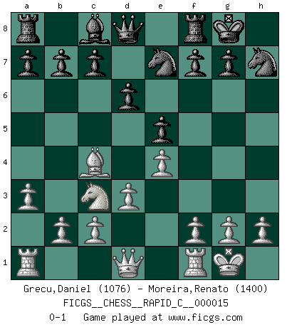 Last move : 0-1 2006 December 18 17:46:30 [Event "FICGS__CHESS__RAPID_C__000015"] [Site "FICGS"] [Date "2006.12.06"] [Round "1"] [White "Grecu,Daniel"] [Black "Moreira,Renato"] [Result "0-1"] [WhiteElo "1076"] [BlackElo "1400"] 1.e4 e5 2.Nf3 Nf6 3.Nc3 Nc6 4.Bc4 Be7 5.Ng5 O-O 6.d3 d6 7.O-O h6 8.a3 hxg5 9.Bxg5 Nh7 10.Bxe7 Nxe7 0-1 Petrov Three knights game Kingside Castling by player Black (move 5) Kingside Castling by player White (move 7) Player Black won this chess game. Follow this game move after move (download)The defensive power of a pinned piece is only imaginary. (Aaron Nimzovich) Garry Kasparov war erst in der Großmeister-Organisation GMA, dann in der Profischach-Vereinigung PCA, zum Schluss kehrte er wieder in den Schoß der FIDE zurück. Aber gut, manche Leute sind flexibel (Viswanathan Anand) Las ideas audaces son como las piezas del Ajedrez que avanzan hacia adelante. Ellas pueden ser vencidas, pero también pueden iniciar una partida victoriosa. (Goethe) Soyez une menace à chaque fois que vous vous asseyez pour jouer. (Ken Smith) I don't believe in psychology. I believe in good moves. (Bobby Fischer)