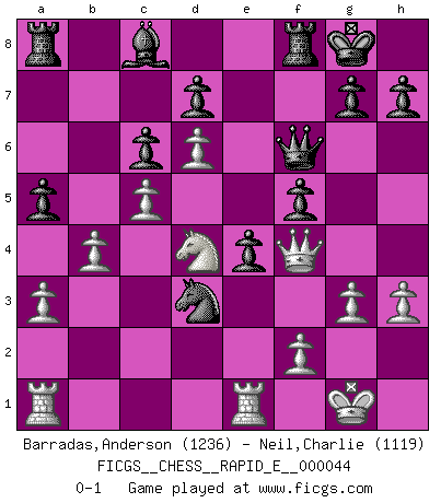 Last move : 0-1 2011 February 1 20:32:51 [Event "FICGS__CHESS__RAPID_E__000044"] [Site "FICGS"] [Date "2011.01.21"] [Round "1"] [White "Barradas,Anderson"] [Black "Neil,Charlie"] [Result "0-1"] [WhiteElo "1236"] [BlackElo "1119"] 1.e4 c5 2.Nf3 Nc6 3.d4 cxd4 4.Nxd4 Nf6 5.Nc3 e6 6.Bg5 Qa5 7.a3 Qxg5 8.Nf3 Qa5 9.Bb5 a6 10.b4 Qd8 11.Bxc6 bxc6 12.O-O Be7 13.e5 Ng4 14.Re1 Bh4 15.g3 Be7 16.Ne4 O-O 17.h3 Nh6 18.Nh2 f5 19.Nd6 Bxd6 20.exd6 Nf7 21.Nf3 Qf6 22.c4 e5 23.c5 e4 24.Nd4 a5 25.Qd2 Ne5 26.Qf4 Nd3 0-1 Sicilian defense Kingside Castling by player White (move 12) Kingside Castling by player Black (move 16) Player Black won this chess game. Follow this game move after move (download)Pawns: they are the soul of this game, they alone form the attack and defense. (Philidor) Schach ist gnadenlos. Du mußt bereit sein zu töten. (Nigel Short) El Ajedrez es en su esencia, un juego. En su forma, un arte. Y en su ejecución, una ciencia. (Baron Tassilo) Les pièces de l'échiquier étaient impitoyables. Elles le retenaient, elles l'absorbaient. Il y avait de l'horreur en cela, mais aussi une harmonie unique. Car, qu'y a-t-il dans le monde, à part les échecs ? (V. Nabokov) Better than a thousand days of diligent study is one day with a great teacher. (Japanese proverb)