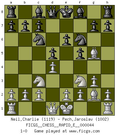 Last move : 1-0 2011 March 9 11:35:16 [Event "FICGS__CHESS__RAPID_E__000044"] [Site "FICGS"] [Date "2011.01.21"] [Round "1"] [White "Neil,Charlie"] [Black "Pech,Jaroslav"] [Result "1-0"] [WhiteElo "1119"] [BlackElo "1002"] 1.d4 f5 2.Nc3 Nf6 3.g3 e6 4.Bg2 Nc6 5.Bg5 d5 6.Nf3 1-0 Dutch Player White won this chess game. Follow this game move after move (download)Different people feel differently about resigning. (Bobby Fischer) Das Zentrum ist der Balkan des Schachbretts - Kriegshandlungen können in jedem Moment ausbrechen. (Aaron Nimzowitsch) Debes de llevar a tu oponente hacia un profundo y obscuro bosque donde 2+2=5, y el camino que conduce a la salida es suficientemente ancho para solamente uno. (Mikhail Tal) Il s'avisa de me proposer d'apprendre les échecs qu'il jouait un peu... me voilà forcené des échecs. J'achète un échiquier, je m'enferme dans ma chambre, j'y passe des jours et des nuits à vouloir apprendre par cur toutes les parties. (Jean-Jacques Rousseau, Confessions) It's not the size of the dog in the fight, it's the size of the fight in the dog. (Mark Twain)