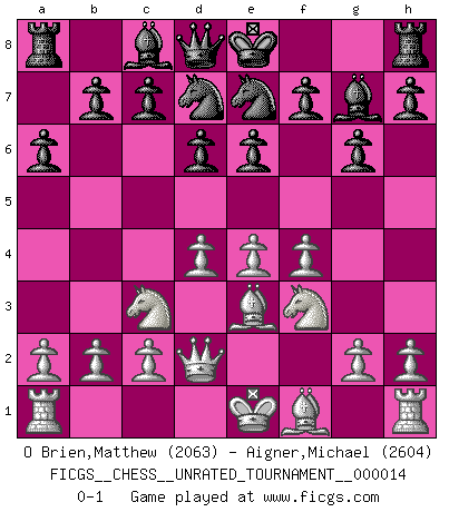 Last move : 0-1 2011 April 18 16:2:31 [Event "FICGS__CHESS__UNRATED_TOURNAMENT__000014"] [Site "FICGS"] [Date "2011.01.22"] [Round "1"] [White "O Brien,Matthew"] [Black "Aigner,Michael"] [Result "0-1"] [WhiteElo "2063"] [BlackElo "2604"] 1.e4 d6 2.d4 g6 3.Nc3 Bg7 4.f4 e6 5.Nf3 Ne7 6.Be3 Nd7 7.Qd2 a6 0-1 This chess game has been lost on time (started : 2011.01.22 14:49:36) King's pawn Opening Player Black won this chess game. Follow this game move after move (download)Chess is as much a mystery as women. (Purdy) Drei Punkte vor allen anderen ist wie einer, der im weißen Anzug posiert, während der Rest in Müllsäcke gekleidet dasteht. (Viktor Kortschnoi) ¿Se han dado cuenta de que Fischer casi nunca ha tenido piezas malas? El las intercambia y las piezas malas se quedan con sus oponenets. (Yuri Balashov) Les échecs sont un jeu par leur forme, un art par leur essence et une science par sa difficulté d'acquisition. Ils peuvent vous procurer autant de plaisir qu'un bon livre ou une belle musique, mais vous n'aurez une réelle joie que si vous arrivez à bien jouer. (Tigran Petrosian) We're missing something. (Gregory House, House M.D.)