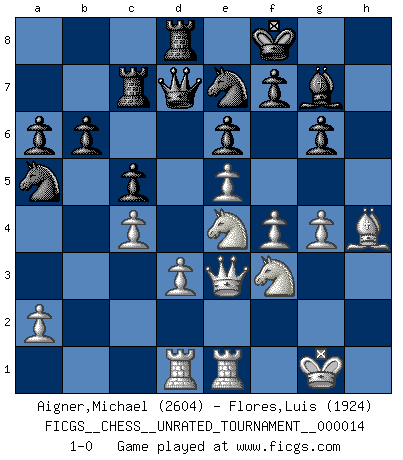 Last move : 1-0 2011 March 25 9:34:3 [Event "FICGS__CHESS__UNRATED_TOURNAMENT__000014"] [Site "FICGS"] [Date "2011.01.22"] [Round "1"] [White "Aigner,Michael"] [Black "Flores,Luis"] [Result "1-0"] [WhiteElo "2604"] [BlackElo "1924"] 1.e4 c5 2.d3 Nc6 3.g3 g6 4.Bg2 Bg7 5.f4 d6 6.Nf3 e6 7.c3 Nge7 8.O-O O-O 9.Be3 b6 10.Na3 Bb7 11.Qe2 Qd7 12.Rad1 d5 13.Bf2 Rfd8 14.Rfe1 d4 15.e5 dxc3 16.bxc3 Na5 17.c4 a6 18.Nb1 Rab8 19.Nc3 h5 20.h3 Nf5 21.g4 hxg4 22.hxg4 Ne7 23.Qe3 Bh6 24.Bh4 Bg7 25.Nd2 Kf8 26.Bxb7 Rxb7 27.Nf3 Rc7 28.Ne4 1-0 Sicilian defense Kingside Castling by player White (move 8) Kingside Castling by player Black (move 8) Player White won this chess game. Follow this game move after move (download)Modern Chess is too much concerned with things like Pawn structure. Forget it, Checkmate ends the game. (Nigel Short) Ein bischen Romantik kann weder im Schach noch in der Liebe schaden. Also versuche ich mich ab und zu daran zu erinnern. (Nigel Short) Aquellos que dicen entender al Ajedrez, no entienden nada. (Robert Hubner) Donnez-moi un Cavalier en 6e et je gagnerais toutes mes parties. (Steinitz) Gambling is the son of avarice and the father of despair. (French proverb)