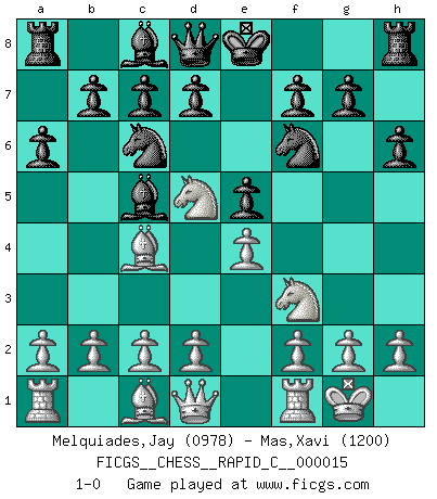 Last move : 1-0 2007 January 14 6:4:21 [Event "FICGS__CHESS__RAPID_C__000015"] [Site "FICGS"] [Date "2006.12.06"] [Round "1"] [White "Melquiades,Jay"] [Black "Mas,Xavi"] [Result "1-0"] [WhiteElo "0978"] [BlackElo "1200"] 1.e4 e5 2.Nf3 Nc6 3.Bb5 a6 4.Bc4 h6 5.Nc3 Bc5 6.O-O Nf6 7.Nd5 1-0 This chess game has been lost on time (started : 2006.12.06 1:42:30) Ruy Lopez (Spanish Opening) Kingside Castling by player White (move 6) Player White won this chess game. Follow this game move after move (download)Of Chess it has been said that life is not long enough for it, but that is the fault of life, not Chess. (William Ewart Napier) Man braucht nicht immer den besten Zug zu spielen: Ein Zug muß aktiv, unternehmungslustig, korrekt und schön sein. (David Bronstein) ¿Esta Bobby Fischer algo cuerdo?. (Salo Flohr) Comme les marins qui ont mille raisons différentes d'aller en mer, les joueurs d'échecs en ont tout autant avant de s'installer devant une table et jouer... (Vincent Bertignac, philosophe) Good decisions come from experience, and experience comes from bad decisions. (Anonymous)
