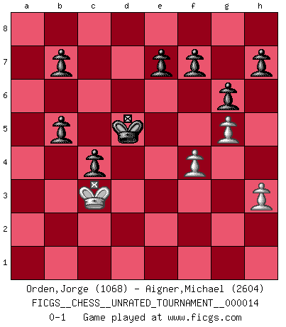 Last move : 0-1 2011 March 18 14:59:27 [Event "FICGS__CHESS__UNRATED_TOURNAMENT__000014"] [Site "FICGS"] [Date "2011.01.22"] [Round "1"] [White "Orden,Jorge"] [Black "Aigner,Michael"] [Result "0-1"] [WhiteElo "1068"] [BlackElo "2604"] 1.e4 g6 2.d4 Bg7 3.Nf3 d6 4.Be2 a6 5.O-O Nf6 6.e5 dxe5 7.dxe5 Qxd1 8.Rxd1 Ng4 9.Bf4 Nc6 10.h3 Ngxe5 11.Nxe5 Bxe5 12.Bxe5 Nxe5 13.c4 Be6 14.Nc3 Bxc4 15.b3 Bxe2 16.Nxe2 Rd8 17.Rxd8+ Kxd8 18.Rd1+ Kc8 19.Nc3 Rd8 20.Nd5 Kb8 21.f4 Nc6 22.Kf2 Nb4 23.Ne3 Rxd1 24.Nxd1 Nxa2 25.Ke3 Nc1 26.b4 Na2 27.b5 axb5 28.g4 c5 29.Kd3 Kc7 30.Ne3 Kd6 31.g5 c4+ 32.Kc2 Nb4+ 33.Kc3 Nd5+ 34.Nxd5 Kxd5 0-1 Robatsch (Modern) defense Kingside Castling by player White (move 5) Player Black won this chess game. Follow this game move after move (download)Up to this point White has been following well-known analysis. But now he makes a fatal error: he begins to use his own head. (Siegbert Tarrasch) Das Schachspiel hat wie die Liebe, die Musik, die Fähigkeit, den Menschen glücklich zu machen. Ich habe ein leises Gefühl des Bedauerns für jeden, der das Schachspiel nicht kennt, so wie ich jeden bedaure, der die Liebe nicht kennt. (Siegbert Tarrasch) El sobresalir en el Ajedrez es un signo de una mente intrigante. (Sir Arthur Conan Doyle) On n'a jamais que l'âge auquel on a commence à jouer aux échecs car après on cesse de vieillir. (Capablanca) The worth of a book is to be measured by what you can carry away from it. (James Bryce)