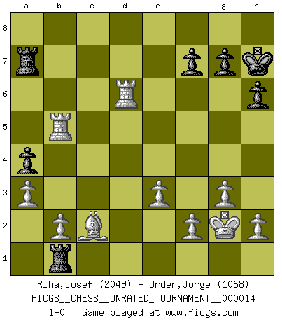 Last move : 1-0 2011 February 3 17:40:54 [Event "FICGS__CHESS__UNRATED_TOURNAMENT__000014"] [Site "FICGS"] [Date "2011.01.22"] [Round "1"] [White "Riha,Josef"] [Black "Orden,Jorge"] [Result "1-0"] [WhiteElo "2049"] [BlackElo "1068"] 1.Nf3 Nf6 2.d4 d5 3.c4 e6 4.Bg5 Be7 5.e3 h6 6.Bh4 O-O 7.Nc3 b6 8.cxd5 exd5 9.Rc1 Bb7 10.Bd3 Nbd7 11.O-O Ne4 12.Bxe7 Qxe7 13.Qb3 c6 14.Rfd1 Ndf6 15.Ne5 Nd7 16.Bxe4 Nxe5 17.dxe5 Qxe5 18.Bf3 Rad8 19.Qa3 a6 20.Na4 b5 21.Nc5 Qe7 22.Qa5 Ra8 23.Qb6 Rab8 24.Nxb7 Qxb7 25.Qxb7 Rxb7 26.Rxc6 Ra7 27.Rxd5 Kh7 28.R5d6 a5 29.Rb6 Rc8 30.Rxb5 Rc1+ 31.Bd1 a4 32.a3 Rac7 33.g3 Rb1 34.Kg2 Ra7 35.Bc2+ 1-0 Reti Opening Kingside Castling by player Black (move 6) Kingside Castling by player White (move 11) Player White won this chess game. Follow this game move after move (download)If I win a tournament, I win it by myself. I do the playing. Nobody helps me. (Bobby Fischer) Wenn ich einen Club besuche, sind die Spieler stumm vor Staunen. (José Raúl Capablanca) Algunos sacrificios son sólidos, los demás son míos. (Mikhail Tal) Il vaut mieux sacrifier les pièces de l'adversaire. (Xavier Tartacover) Think like a man of action, act like a man of thought. (Henri Louis Bergson)