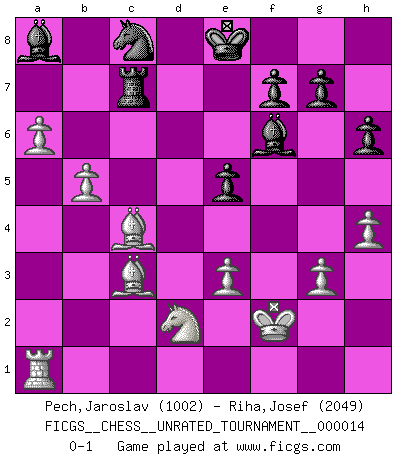 Last move : 0-1 2011 September 28 11:4:41 [Event "FICGS__CHESS__UNRATED_TOURNAMENT__000014"] [Site "FICGS"] [Date "2011.01.22"] [Round "1"] [White "Pech,Jaroslav"] [Black "Riha,Josef"] [Result "0-1"] [WhiteElo "1002"] [BlackElo "2049"] 1.e4 e5 2.Nf3 Nc6 3.Bb5 a6 4.Ba4 d6 5.O-O b5 6.Bb3 Nf6 7.Re1 Be7 8.c3 O-O 9.h3 Na5 10.Bc2 c5 11.d4 Qc7 12.Nbd2 Bd7 13.Nf1 cxd4 14.cxd4 Rfc8 15.Ne3 Nc4 16.Nxc4 bxc4 17.Bd2 Bb5 18.Rc1 Rab8 19.Bc3 Nd7 20.Qe2 a5 21.a4 Ba6 22.Qd2 Bf6 23.Bxa5 Qa7 24.Bc3 Re8 25.Red1 Nf8 26.dxe5 dxe5 27.Qe3 Qxe3 28.fxe3 Ng6 29.a5 Ra8 30.Ra1 Rec8 31.g3 Rc7 32.Ba4 h6 33.Rd6 Bb7 34.Rd7 Rac8 35.Bb5 Bxe4 36.Rxc7 Rxc7 37.Nd2 Ba8 38.a6 Bg5 39.Kf2 Ne7 40.h4 Bf6 41.Bxc4 Kf8 42.b4 Nc8 43.b5 Ke8 0-1 This chess game has been lost on time (started : 2011.01.22 14:49:36) Ruy Lopez : Modern Steinitz defense, 5.O-O Kingside Castling by player White (move 5) Kingside Castling by player Black (move 8) Player Black won this chess game. Follow this game move after move (download)Combinations have always been the most intriguing aspect of Chess. The masters look for them, the public applauds them, the critics praise them. It is because combinations are possible that Chess is more than a lifeless mathematical exercise. They are the poetry of the game; they are to Chess what melody is to music. They represent the triumph of mind over matter. (Reuben Fine) Oft bringt ein stiller Zug das Erdbeben. (Richard Reti) Dios mío, Bobby Fischer juega tan simple. (Alexei Suetin) Plusieurs personnes se sont demandées comment Tal faisait pour gagner... En fait, c'est très simple ! Il met ses pièces au centre de l'échiquier et les sacrifie quelque part ! (David Bronstein) Every man's memory is his private literature. (Aldous Huxley)