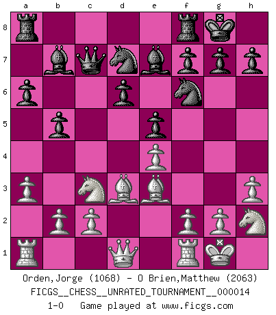 Last move : 1-0 2011 June 1 7:7:3 [Event "FICGS__CHESS__UNRATED_TOURNAMENT__000014"] [Site "FICGS"] [Date "2011.01.22"] [Round "1"] [White "Orden,Jorge"] [Black "O Brien,Matthew"] [Result "1-0"] [WhiteElo "1068"] [BlackElo "2063"] 1.e4 c5 2.Nf3 d6 3.d4 cxd4 4.Nxd4 Nf6 5.Nc3 a6 6.Be2 e5 7.Nf3 Be7 8.O-O O-O 9.h3 b5 10.Be3 Bb7 11.Bd3 Nbd7 12.a3 Qc7 13.Nh2 1-0 This chess game has been lost on time (started : 2011.01.22 14:49:36) Sicilian : Najdorf, Opovcensky variation Kingside Castling by player White (move 8) Kingside Castling by player Black (move 8) Player White won this chess game. Follow this game move after move (download)I prefer to lose a really good game than to win a bad one. (David Levy) Die Partien sind immer verschieden, die Interviews immer die gleichen. (Garry Kasparov) El hombre es un frívolo, una creatura engañosa y como un jugador de Ajedrez, se preocupa mas por el proceso de obtener su meta que de la meta por sí misma. (Dostoyevsky) Mon pion favori sur ma case favorite ! Bronstein en parlant d'un coup de pion en h5 quand il avait les Noirs. Perseverance does not equal worthiness. Next time you want to get my attention, wear something fun. Low-riding jeans are hot. (Gregory House, House M.D.)