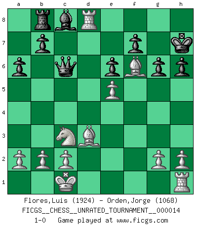 Last move : 1-0 2011 February 4 17:3:55 [Event "FICGS__CHESS__UNRATED_TOURNAMENT__000014"] [Site "FICGS"] [Date "2011.01.22"] [Round "1"] [White "Flores,Luis"] [Black "Orden,Jorge"] [Result "1-0"] [WhiteElo "1924"] [BlackElo "1068"] 1.e4 c5 2.Nf3 d6 3.d4 cxd4 4.Nxd4 Nf6 5.Nc3 a6 6.Bg5 e6 7.f4 Be7 8.Qf3 h6 9.Bh4 Nc6 10.O-O-O Qb6 11.Nxc6 Qxc6 12.Be2 Rb8 13.Qd3 O-O 14.e5 dxe5 15.fxe5 Rd8 16.Qxd8+ Bxd8 17.Rxd8+ Kh7 18.Bd3+ g6 19.Bxf6 1-0 Sicilian : Najdorf, 7...Be7 Queenside Castling by player White (move 10) Kingside Castling by player Black (move 13) Player White won this chess game. Follow this game move after move (download)The beauty of a move lies not in its' appearance but in the thought behind it. (Siegbert Tarrasch) Bobby Fischer ist kein Vorbild für die heutige Jugend. (Viktor Kortschnoi) El Ajedrez, como la música, como el amor, tiene el poder de hacer feliz a la gente. (Siegbert Tarrasch) Tout change constamment, y compris dans le monde des Echecs. (Botvinnik) You have to believe in yourself. (Sun Tzu)