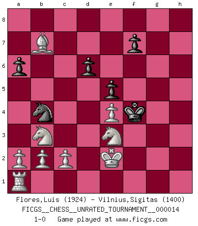 Last move : 1-0 2011 February 10 10:34:19 [Event "FICGS__CHESS__UNRATED_TOURNAMENT__000014"] [Site "FICGS"] [Date "2011.01.22"] [Round "1"] [White "Flores,Luis"] [Black "Vilnius,Sigitas"] [Result "1-0"] [WhiteElo "1924"] [BlackElo "1400"] 1.e4 c5 2.Nf3 d6 3.d4 cxd4 4.Nxd4 Nf6 5.Nc3 a6 6.Bg5 Nc6 7.Qd2 Qb6 8.Nb3 Bg4 9.h3 Bh5 10.Be3 Qc7 11.f4 e5 12.f5 Be7 13.g4 Nxg4 14.hxg4 Bxg4 15.Qg2 h5 16.Nd5 Qd8 17.Qxg4 hxg4 18.Rxh8+ Bf8 19.f6 gxf6 20.Bh6 Kd7 21.Rxf8 Qxf8 22.Bxf8 Rxf8 23.Nxf6+ Ke6 24.Nxg4 Nb4 25.Ne3 Rc8 26.Bh3+ Kf6 27.Bxc8 Kg5 28.Bxb7 Kf4 29.Ke2 1-0 Sicilian : Najdorf, 6.Bg5 Player White won this chess game. Follow this game move after move (download)I like to say that Bobby Fischer was the greatest player ever. But what made Fischer a genius was his ability to blend an American freshness and pragmatism with Russian ideas about strategy. (Bruce Pandolfini) Kann Schach nicht schließlich das Nationalspiel der Deutschen werden? Und welche weiteren Ausblicke bieten sich dann dar! Welche Hebung des allgemeinen Kultur-Niveaus, ja der Moral, wenn das Schachbrett den Kartentisch verdrängen würde! Wahrlich, ein Ziel, des Schweißes der Edlen wert! (Siegbert Tarrasch) Alekhine es un poeta que crea un trabajo de arte de algo que raramente inspiraría a otra persona a mandar una tarjeta postal. (Max Euwe) Le moment que je préfère le plus dans une rencontre, c'est celui où je sens que la personnalité de l'adversaire se brise. (Robert Fischer) Knowledge will give you power, but character respect. (Bruce Lee)